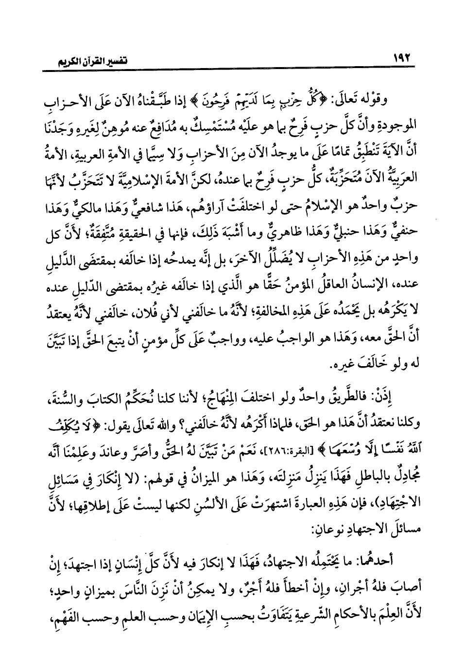 وقوْله تَعالَى: {كُلُّ حِزْبٍ بِمَا لَدَيْهِمْ فَرِحُونَ} إذا طَبَّقْناهُ الآن عَلَى الأحزابِ الموجودةَ وأنَّ كلَّ حزبٍ فَرِحٌ بما هو علَيْه مُسْتَمْسِكٌ به مُدَافِعٌ عنه مُوهِنٌ لِغَيرهِ وَجَدْنَا أنَّ الآيَةَ تَنْطَبِقُ تمامًا عَلَى ما يوجدُ الآن مِنَ الأحزابِ وَلا سِيَّما في الأمةِ العربيةِ، الأمةُ العرَبِيَّةُ الآنَ مُتَحَزِّبَةٌ، كلّ حزبٍ فَرِحٌ بما عندهُ، لكنَّ الأمةَ الإسْلامِيَّةَ لا تَتَحَزَّبُ لأنَّهَا حزبٌ واحدٌ هو الإسْلامُ حتى لو اختلفَتْ آراؤهُم، هَذا شافعيٌّ وَهَذا مالكيٌّ وَهَذا حنفيٌّ وَهَذا حنبليٌّ وَهَذا ظاهريٌّ وما أَشْبَهَ ذَلِكَ، فإنها في الحقيقةِ مُتَّفِقَة؛ لأَنَّ كل واحدٍ من هَذِهِ الأحزابِ لا يُضَلِّلُ الآخرَ، بل إنَّه يمدحُه إذا خالَفه بمقتضَى الدَّليلِ عنده، الإنسانُ العاقلُ المؤمنُ حَقًّا هو الَّذي إذا خالَفه غيرُه بمقتضى الدّليلِ عنده لا يَكْرَهُه بل يَحْمَدُه عَلَى هَذِهِ المخالفةِ؛ لأنَّهُ ما خالَفني لأني فُلان، خالَفني لأَنَّهُ يعتقدُ أنَّ الحقَّ معه، وَهَذا هو الواجبُ عليه، وواجبٌ عَلَى كلِّ مؤمنٍ أنْ يتبعَ الحقَّ إذا تبَيَّنَ له ولو خَالَفَ غيره.