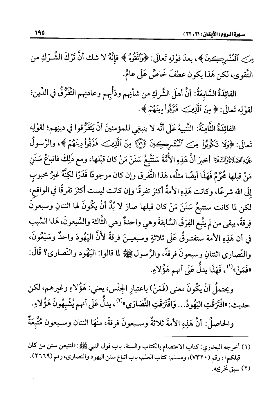 الفائِدَةُ الثَّامِنهُ: التَّنبيهُ عَلَى أنَّه لا ينبغِي للمؤمنينَ أنْ يَتَفَرُّقوا في دينِهم؛ لقوْلِه تَعالَى: {وَلَا تَكُونُوا مِنَ الْمُشْرِكِينَ (٣١) مِنَ الَّذِينَ فَرَّقُوا دِينَهُمْ}، والرَّسولُ عَلَيْهَ الصَّلَاةُ وَالسَّلَامُ أخبرَ أنَّ هَذِهِ الأُمَّةَ سَتَتَّبعُ سَنَنَ مَنْ كان قبْلها، ومع ذَلِكَ فاتباعُ سَنَنِ مَنْ قبلها مُحرَّمٌ فَهَذَا أيضًا مثلُه، هَذا التَّفرق وإن كان موجودًا قَدَرًا لكِنَّهُ غيرُ محبوبٍ إِلَى الله شرعًا، وكانت هَذِهِ الأمةُ أكثرَ تفرقًا وإن كانت ليست أكثرَ تفرقًا في الواقعِ، لكن لما كانت ستتبعُ سَنَنَ مَنْ كان قبلها صارَ لا بُدَّ أنْ يكُونَ لها اثنتانِ وسبعونَ فِرقةً، يبقى من لم يتَّبع الفِرَقَ السَّابقةَ وهي واحدةٌ وهي الثَّالثة والسَّبعونَ، هَذا السَّبب في أن هَذِهِ الأمة ستفترقُ عَلَى ثلاثةٍ وسبعينَ فرقةً لأَنَّ اليَهُودَ واحدٌ وسَبْعُونَ، والنّصارى اثنتانِ وسبعونَ فرقةً، والرَّسول - صلى الله عليه وسلم - لما قالوا: اليَهُود والنّصارى؟ قَالَ: "فَمَنْ" (¬١)، فَهَذَا يدلُّ عَلَى أنهم هَؤُلاءِ.