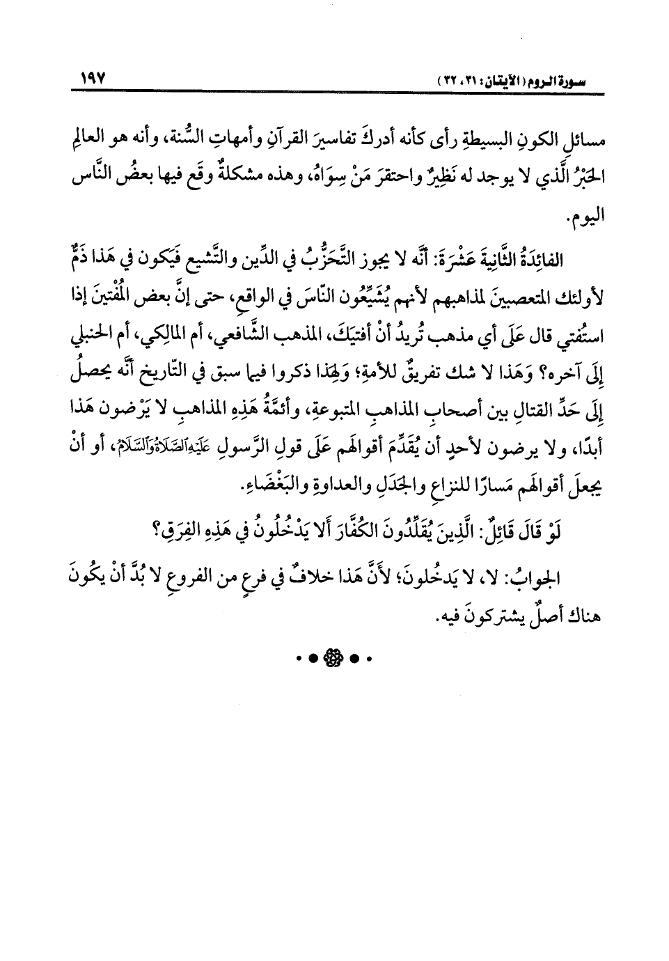 الفائِدَةُ الثَّانيَةُ عشرة: أنَّه لا يجوز التَّحَزُّبُ في الدِّين والتَّشيع فَيَكون في هَذا ذَمٌّ لأولئك المتعصبينَ لمذاهبهم لأنهم يُشَيِّعُون النّاسَ في الواقعِ، حتى إنَّ بعض المُفْتينَ إذا استُفتي قال عَلَى أي مذهب تُريدُ أنْ أفتيَكَ، المذهب الشَّافعي، أم المالِكي، أم الحنبلي إِلَى آخره؟ وَهَذا لا شك تفريقٌ للأمةِ؛ وَهذا ذكروا فيما سبق في التّاريخ أنَّه يحصلُ إِلَى حَدِّ القتالِ بين أصحابِ المذاهبِ المتبوعةِ، وأئمَّةُ هَذِهِ المذاهبِ لا يَرْضون هَذا أبدًا, ولا يرضون لأحدٍ أن يُقَدِّمَ أقوالَهم عَلَى قولِ الرَّسولِ عَلَيْهَ الصَّلَاةُ وَالسَّلَامُ، أو أنْ يجعلَ أقوالَهم مَسارًا للنزاعِ والجدَلِ والعداوةِ والبَغْضَاءِ.
