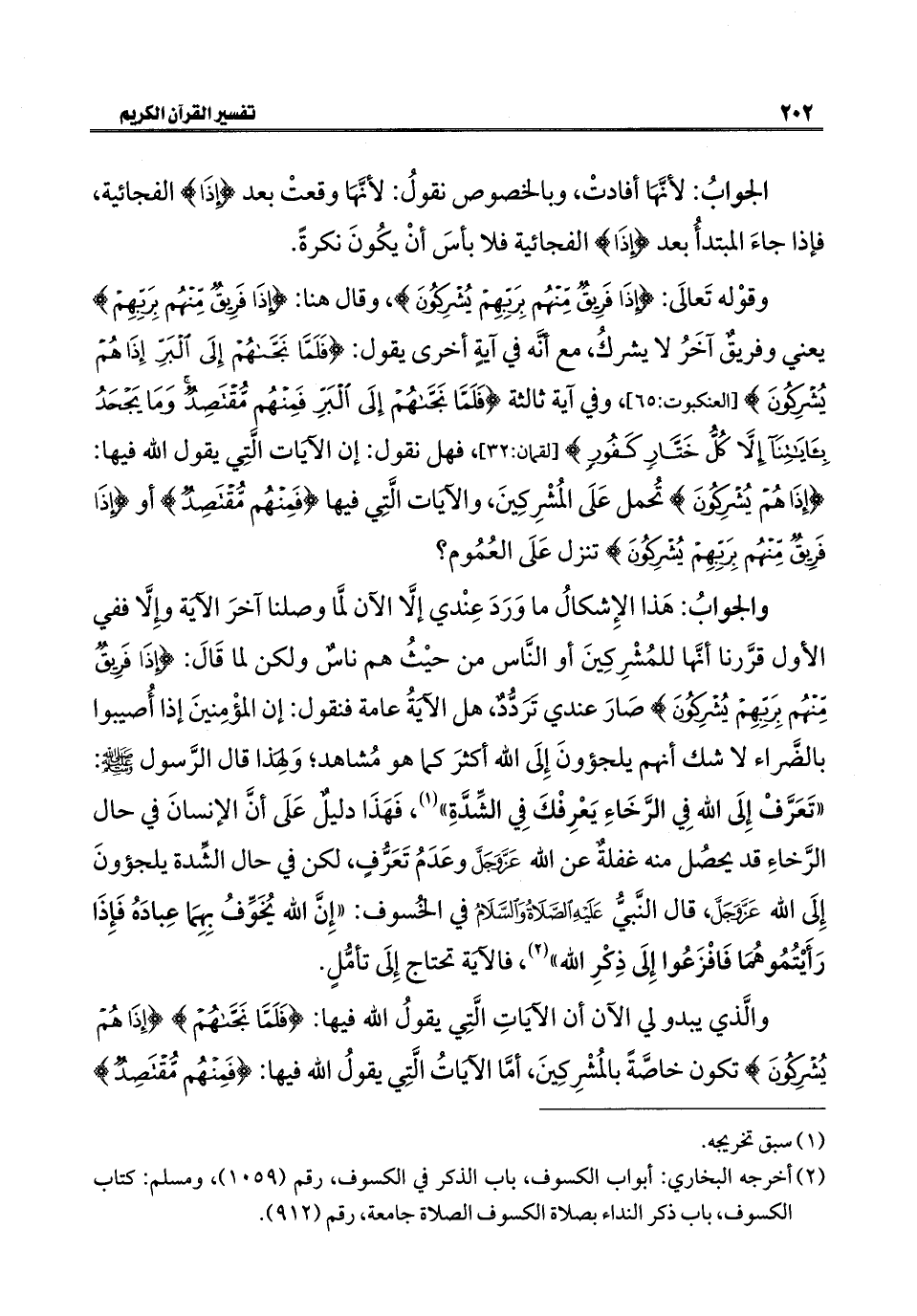 وقوْله تَعالَى: {إِذَا فَرِيقٌ مِنْهُمْ بِرَبِّهِمْ يُشْرِكُونَ}، وقال هنا: {إِذَا فَرِيقٌ مِنْهُمْ بِرَبِّهِمْ} يعني وفريقٌ آخَرُ لا يشركُ، مع أنه في آيةٍ أخرى يقول: {فَلَمَّا نَجَّاهُمْ إِلَى الْبَرِّ إِذَا هُمْ يُشْرِكُونَ} [العنكبوت: ٦٥]، وفي آية ثالثة {فَلَمَّا نَجَّاهُمْ إِلَى الْبَرِّ فَمِنْهُمْ مُقْتَصِدٌ وَمَا يَجْحَدُ بِآيَاتِنَا إِلَّا كُلُّ خَتَّارٍ كَفُورٍ (٣٢)} [لقمان: ٣٢]، فهل نقول: إن الآيات الَّتِي يقول الله فيها: {إِذَا هُمْ يُشْرِكُونَ} تُحمل عَلَى المُشْرِكِينَ، والآيات الَّتِي فيها {فَمِنْهُمْ مُقْتَصِدٌ} أو {إِذَا فَرِيقٌ مِنْهُمْ بِرَبِّهِمْ يُشْرِكُونَ} تنزل عَلَى العُمُوم؟