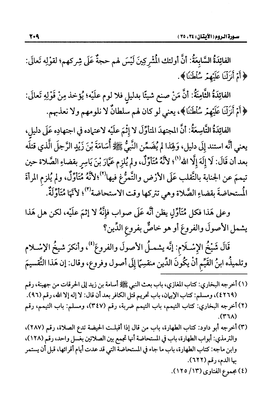 الفائِدَةُ التَّاسِعَةُ: أن المجتهدَ المتأوِّلَ لا إِثْمَ علَيْه لاعتماده في اجتهادِه عَلَى دليلٍ، يعني أنه استند إِلَى دليل، وَلهذا لم يُضَمِّن النَّبيُّ - صلى الله عليه وسلم - أُسَامَةَ بْنَ زيدٍ الرَّجلَ الَّذي قتلَه بعد أن قَالَ: لَا إِلَهَ إِلَّا الله (¬١)؛ لأنهُ مُتَأوِّلٌ، ولم يُلزِم عَمَّارَ بْنَ يَاسِر بقضاءِ الصَّلاة حين تيممَ عن الجنابة بالتَّقلب عَلَى الأرْض والتَّمرُّغ فيها (¬٢)، لأَنَّهُ مُتَأوِّلٌ، ولم يُلزمِ المرأةَ المُستحاضةَ بقضاءِ الصَّلاة وهي تتركها وقت الاستحاضة (¬٣)؛ لأنَّهَا مُتَأوِّلَةٌ.