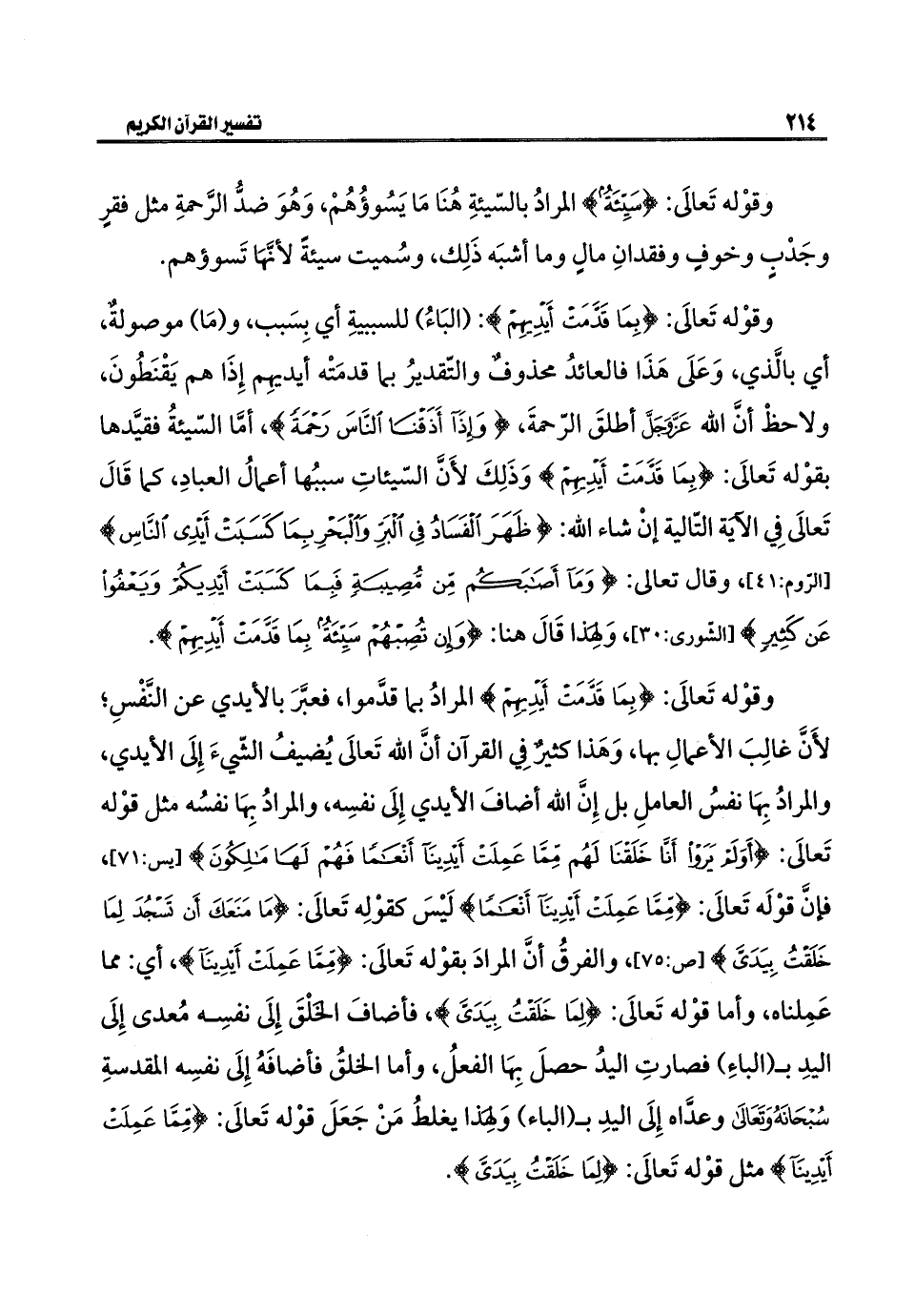 وقوْله تَعالَى: {بِمَا قَدَّمَتْ أَيْدِيهِمْ} المرادُ بما قدَّموا، فعبَّرَ بالأيدي عن النَّفْسِ؛ لأَنَّ غالِبَ الأعمالِ بها، وَهَذا كثير فِي القرآن أنَّ الله تَعالَى يُضيفُ الشّيءَ إِلَى الأيدي، والمرادُ بِهَا نفسُ العاملِ بل إِنَّ الله أضافَ الأيدي إِلَى نفسِه، والمرادُ بِهَا نفسُه مثل قوْله تَعالَى: {أَوَلَمْ يَرَوْا أَنَّا خَلَقْنَا لَهُمْ مِمَّا عَمِلَتْ أَيْدِينَا أَنْعَامًا فَهُمْ لَهَا مَالِكُونَ (٧١)} [يس: ٧١]، فإنَّ قوْلَه تَعالَى: {مِمَّا عَمِلَتْ أَيْدِينَا أَنْعَامًا} لَيْسَ كقوْلِه تَعالَى: {مَا مَنَعَكَ أَنْ تَسْجُدَ لِمَا خَلَقْتُ بِيَدَيَّ} [ص: ٧٥]، والفرقُ أنَّ المرادَ بقوْله تَعالَى: {مِمَّا عَمِلَتْ أَيْدِينَا}، أي: مما عَمِلناه، وأما قوْله تَعالَى: {لِمَا خَلَقْتُ بِيَدَيَّ}، فأضافَ الخلْقَ إِلَى نفسِه مُعدى إِلَى اليدِ بـ (الباءِ) فصارتِ اليدُ حصلَ بِهَا الفعلُ، وأما الخلقُ فأضافَهُ إِلَى نفسِه المقدسةِ سبحانه وَتَعَالى وعدَّاه إِلَى اليدِ بـ (الباء) وَلهذا يغلطُ مَنْ جَعَلَ قوْله تَعالَى: {مِمَّا عَمِلَتْ أَيْدِينَا} مثل قوْله تَعالَى: {لِمَا خَلَقْتُ بِيَدَيَّ}.