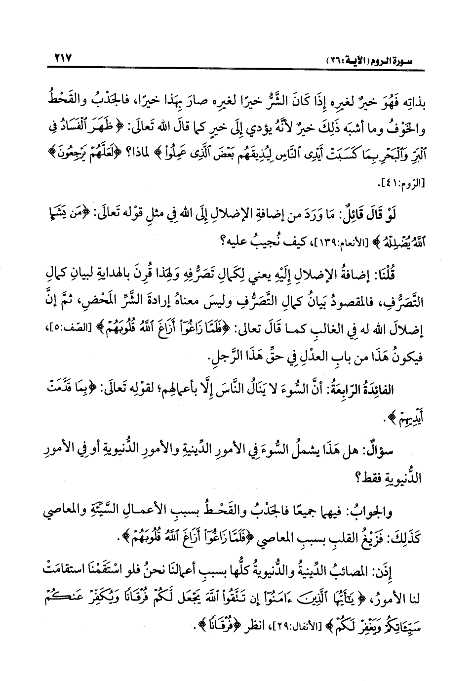 قُلْنَا: إضافةُ الإضلالِ إِلَيْهِ يعني لِكَمالِ تَصَرُّفِهِ وَلهذا قُرِنَ بالهدايةِ لبيانِ كمالِ التَّصَرُّفِ، فالمقصودُ بَيانُ كمالِ التَّصرُّفِ وليسَ معناهُ إرادةَ الشَّرّ المَحْضِ، ثمَّ إنَّ إضلالَ الله له فِي الغالبِ كما قَالَ تعالى: {فَلَمَّا زَاغُوا أَزَاغَ اللَّهُ قُلُوبَهُمْ} [الصف: ٥]، فيكونُ هَذَا من بابِ العدْلِ فِي حقّ هَذَا الرَّجلِ.