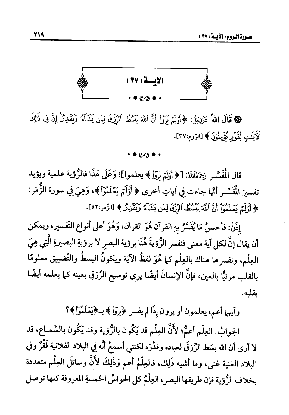 إِذَنْ: فأحسنُ مَا يُفَسَّرُ بِهِ القرآن هُوَ القرآن، وَهُوَ أعلى أنواع التّفسير، ويمكن أن يقال إنَّ لكل آية معنى فنفسر الرُّوْيةَ هُنَا برؤية البصرِ لا برؤية البصيرة التِي هِيَ العِلْم، ونفسرها هناك بالعِلْم كما هُوَ لفظُ الآية ويكونُ البسطُ والتّضييق معلومًا بالقلب مرئيًّا بالعين، فإنَّ الإنسانَ أيضًا يرى توسيع الرِّزقِ بعينه كما يعلمه أيضًا بقلبه.