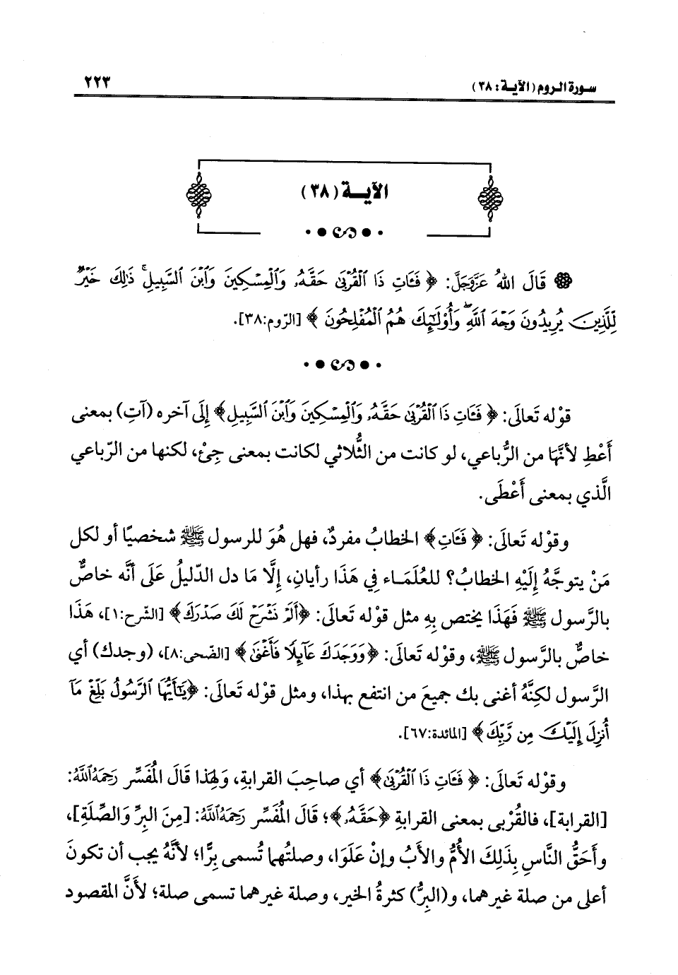 قوْله تَعالَى: {فَآتِ ذَا الْقُرْبَى حَقَّهُ وَالْمِسْكِينَ وَابْنَ السَّبِيلِ} إِلَى آخره (آتِ) بمعنى أَعْطِ لأنَّهَا من الرُّباعي، لو كانت من الثُّلاثي لكانت بمعنى جِئْ، لكنها من الرّباعي الَّذي بمعنى أَعْطَى.