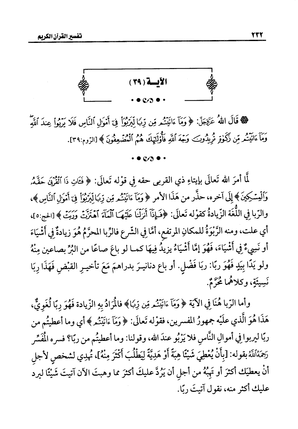 لمَّا أمرَ الله تَعالَى بإيتاءِ ذي القربى حقه فِي قوْله تَعالَى: {فَآتِ ذَا الْقُرْبَى حَقَّهُ وَالْمِسْكِينَ} إِلَى آخره، حذَّر من هَذَا الأمر {وَمَا آتَيْتُمْ مِنْ رِبًا لِيَرْبُوَ فِي أَمْوَالِ النَّاسِ}، والرّبا فِي اللُّغَة الزّيادةُ كقوْله تَعالَى: {فَإِذَا أَنْزَلْنَا عَلَيْهَا الْمَاءَ اهْتَزَّتْ وَرَبَتْ} [الحج: ٥]، أي علت، ومنه الرَّبْوَةُ للمكانِ المرتفعِ، أمَّا فِي الشّرع فالرِّبا المحرَّمُ هُوَ زيادةٌ فِي أَشْيَاءَ أو نَسِيءٌ فِي أَشْيَاءَ، فَهُوَ إمَّا أَشْيَاءُ يزيدُ فِيهَا كما لو باعَ صاعًا من البُرِّ بصاعين مِنْهُ ولو يَدًا بِيَدٍ فَهُوَ ربًا: ربَا فَضْلٍ. أو باع دنانيرَ بدراهمَ مَعَ تأخيرِ القبْضِ فَهَذَا رِبَا نَسِيئَةٍ، وكلاهُما محُرَّمٌ.