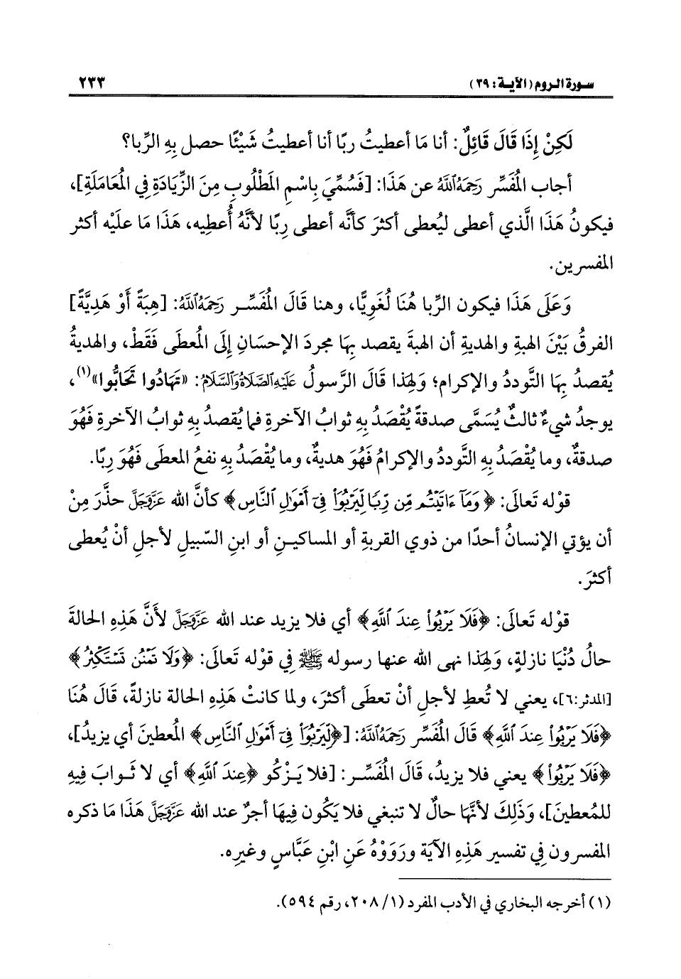 وَعَلَى هَذَا فيكون الرِّبا هُنَا لُغَوِيًّا، وهنا قَالَ المُفَسِّر رَحَمَهُ الله: [هِبَة أَوْ هَدِيَّة] الفرقُ بَيْنَ الهبةِ والهديةِ أن الهبةَ يقصد بِهَا مجردَ الإحسَانِ إِلَى المُعطَى فَقَطْ، والهديةُ يُقصدُ بِهَا التَّوددُ والإكرام؛ وَلهذا قَالَ الرَّسولُ - صلى الله عليه وسلم -: "تَهَادُوا تَحَابُّوا" (¬١)، يوجدُ شيءٌ ثالثٌ يُسَمَّى صدقةً يُقْصَدُ بِهِ ثوابُ الآخرةِ فما يُقصدُ بِهِ ثوابُ الآخرةِ فَهُوَ صدقةٌ، وما يُقْصَدُ بِهِ التَّوددُ والإكرامُ فَهُوَ هديةٌ، وما يُقْصَدُ بِهِ نفعُ المعطَى فَهُوَ رِبًا.