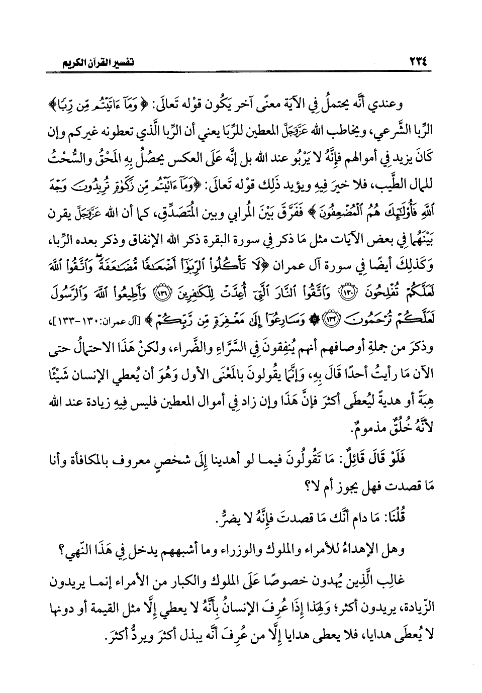 وعندي أنه يحتملُ فِي الآية معنًى آخر يَكُون قوْله تَعالَى: {وَمَا آتَيْتُمْ مِنْ رِبًا} الرِّبا الشَّرعي، ويخاطب الله عز وجل المعطين للرِّبَا يعني أن الرِّبا الَّذي تعطونه غيركم وإن كَانَ يزيد فِي أموالهم فإِنَّهُ لا يَرْبُو عند الله بل إنَّه عَلَى العكس يحصلُ بِهِ المَحْقُ والسُّحْتُ للمال الطَّيب، فلا خيرَ فِيهِ ويؤيد ذَلِك قوْله تَعالَى: {وَمَا آتَيْتُمْ مِنْ زَكَاةٍ تُرِيدُونَ وَجْهَ اللَّهِ فَأُولَئِكَ هُمُ الْمُضْعِفُونَ} فَفَرَّقَ بَيْنَ المُرابي وبين المتصَدِّقِ، كما أن الله عز وجلَّ يقرن بَيْنَهُما فِي بعض الآيات مثل مَا ذكر فِي سورة البقرة ذكر الله الإنفاق وذكر بعده الرِّبا، وَكَذلِكَ أيضًا فِي سورة آل عمران {لَا تَأْكُلُوا الرِّبَا أَضْعَافًا مُضَاعَفَةً وَاتَّقُوا اللَّهَ لَعَلَّكُمْ تُفْلِحُونَ (١٣٠) وَاتَّقُوا النَّارَ الَّتِي أُعِدَّتْ لِلْكَافِرِينَ (١٣١) وَأَطِيعُوا اللَّهَ وَالرَّسُولَ لَعَلَّكُمْ تُرْحَمُونَ (١٣٢) وَسَارِعُوا إِلَى مَغْفِرَةٍ مِنْ رَبِّكُمْ} [آل عمران: ١٣٠ - ١٣٣]، وذكرَ من جملةِ أوصافهم أنهم يُنفِقونَ فِي السَّرَّاءِ والضَّراء، ولكنْ هَذَا الاحتمالُ حتى الآن مَا رأيتُ أحدًا قَالَ بِهِ، وَإنَّمَا يقُولونَ بالمَعْنَى الأول وَهُوَ أن يُعطي الإنسان شَيْئًا هِبَةً أو هديةً ليُعطَى أكثرَ فإنَّ هَذَا وإن زاد فِي أموال المعطين فليس فِيهِ زيادة عند الله لأنَّهُ خُلُقٌ مذمومٌ.