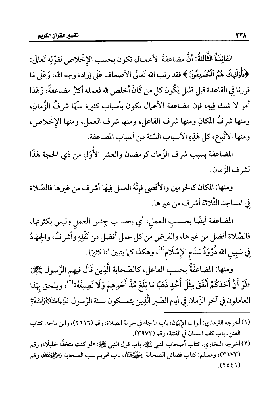 الفائِدَةُ الثَّالثةُ: أنَّ مضاعفةَ الأعمال تكون بحسب الإِخْلاص لقوْلِه تَعالَى: {فَأُولَئِكَ هُمُ الْمُضْعِفُونَ} فقد رتب الله تَعالَى الأضعاف عَلَى إرادة وجه الله، وَعَلَى مَا قررنا فِي القاعدة قبل قليل يَكُون كل من كَانَ أخلص لله فعمله أكثرُ مضاعفةً، وَهَذا أمر لا شك فِيهِ، فإن مضاعفة الأعمال تكون بأسباب كثيرة منْهَا شرفُ الزَّمانِ، ومنها شرفُ المكانِ ومنها شرف الفاعل، ومنها شرف العمل، ومنها الإِخْلاص، ومنها الاتِّباع، كل هَذِهِ الأسباب السّتة من أسباب المضاعفة.