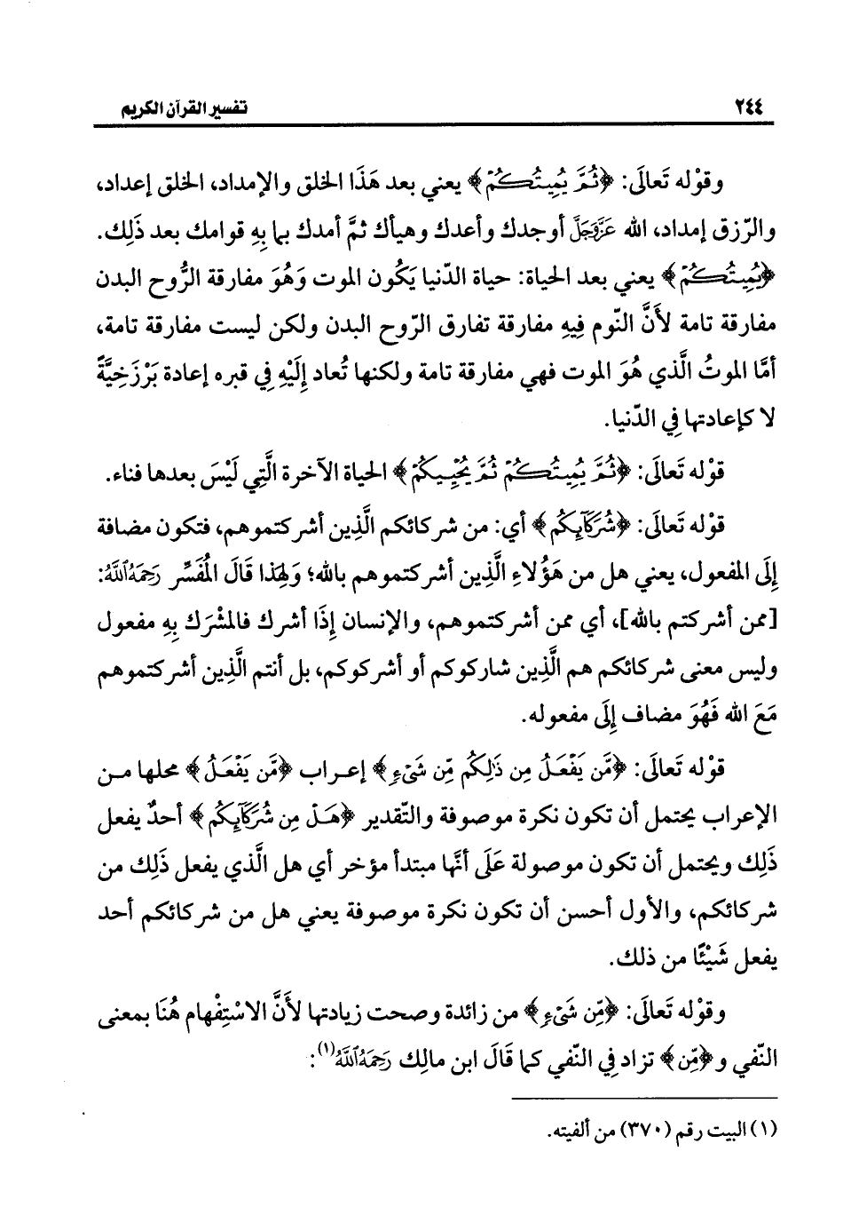 وقوْله تَعالَى: {ثُمَّ يُمِيتُكُمْ} يعني بعد هَذَا الخلق والإمداد، الخلق إعداد، والرّزق إمداد، الله عز وجل أوجدك وأعدك وهيأك ثم أمدك بما بِهِ قوامك بعد ذَلِك. {يُمِيتُكُمْ} يعني بعد الحياة: حياة الدّنيا يَكون الموت وَهُوَ مفارقة الرُّوح البدن مفارقة تامة لأَنَّ النوم فِيهِ مفارقة تفارق الرّوح البدن ولكن ليست مفارقة تامة، أمَّا الموتُ الَّذي هُوَ الموت فهي مفارقة تامة ولكنها تُعاد إِلَيْهِ فِي قبره إعادة بَرْزَخِيَّةً لا كإعادتها فِي الدّنيا.
