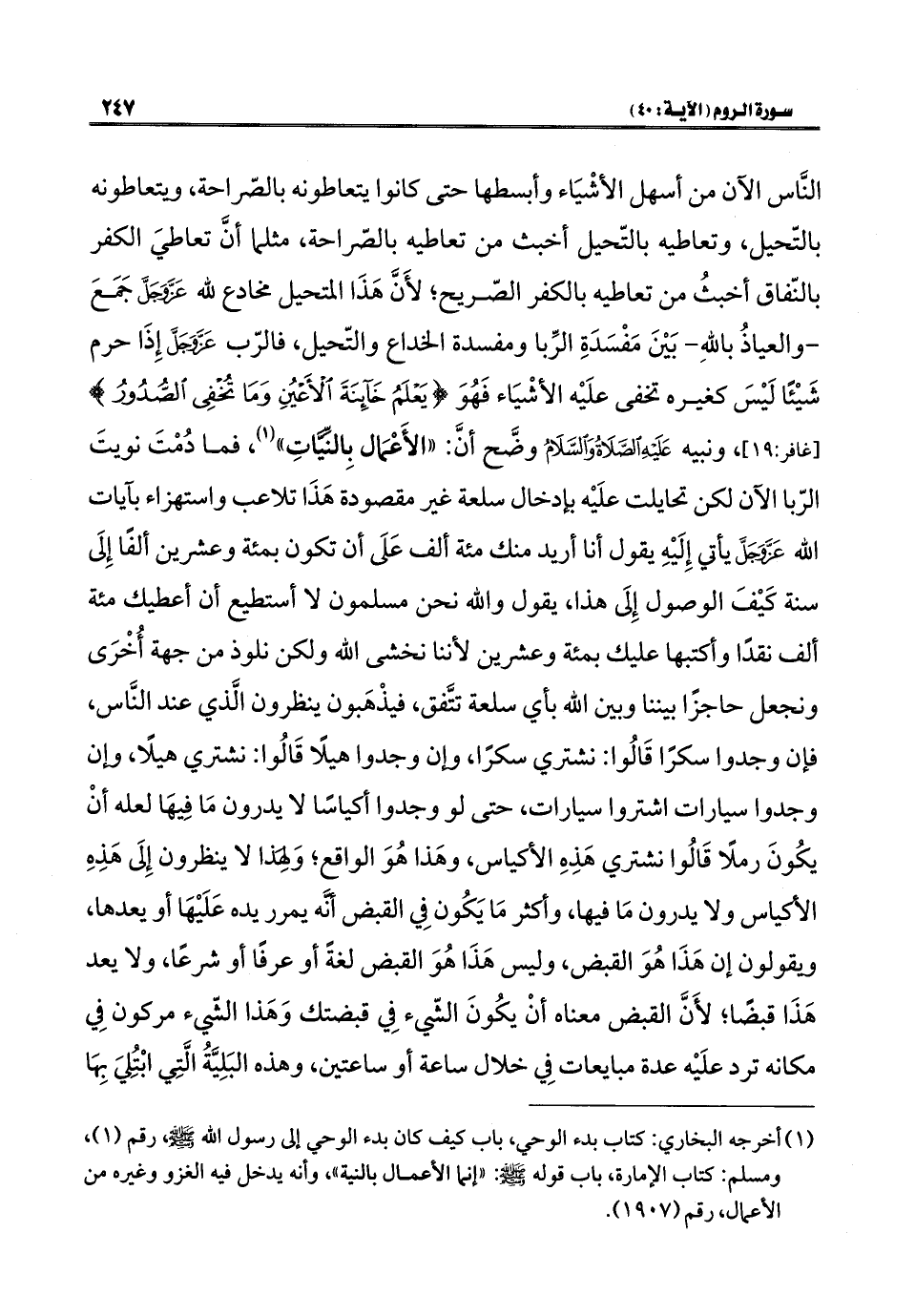 النَّاس الآن من أسهل الأشْيَاء وأبسطها حتى كانوا يتعاطونه بالصّراحة، ويتعاطونه بالتّحيل، وتعاطيه بالتّحيل أخبث من تعاطيه بالصّراحة، مثلما أنَّ تعاطيَ الكفر بالنّفاق أخبثُ من تعاطيه بالكفر الصّريح؛ لأَنَّ هَذَا المتحيل مخادع لله عَز وَجَلَّ جَمَعَ - والعياذُ باللهِ - بَيْنَ مَفْسَدَةِ الرِّبا ومفسدة الخداع والتّحيل، فالرّب عَز وجل إِذَا حرم شَيْئًا لَيْسَ كغيره تخفى علَيْه الأشْيَاء فَهُوَ {يَعْلَمُ خَائِنَةَ الْأَعْيُنِ وَمَا تُخْفِي الصُّدُورُ (١٩)} [غافر: ١٩]، ونبيه - صلى الله عليه وسلم - وضَّح أنَّ: "الأَعْمَال بِالنياتِ" (¬١)، فما دُمْتَ نويتَ الرّبا الآن لكن تحايلت علَيْه بإدخال سلعة غير مقصودة هَذَا تلاعب واستهزاء بآيات الله عز وَجَلَّ يأتي إِلَيْهِ يقول أنا أريد منك مئة ألف عَلَى أن تكون بمئة وعشرين ألفًا إِلَى سنة كَيْفَ الوصول إِلَى هذا، يقول والله نحن مسلمون لا أستطيع أن أعطيك مئة ألف نقدًا وأكتبها عليك بمئة وعشرين لأننا نخشى الله ولكن نلوذ من جهة أُخْرَى ونجعل حاجزًا بيننا وبين الله بأي سلعة تتَّفق، فيذْهَبون ينظرون الَّذي عند النَّاس، فإن وجدوا سكرًا قَالُوا: نشتري سكرًا، وإن وجدوا هيلًا قَالُوا: نشتري هيلًا، وإن وجدوا سيارات اشتروا سيارات، حتى لو وجدوا أكياسًا لا يدرون مَا فِيهَا لعله أنْ يكُونَ رملًا قَالُوا نشتري هذه الأكياس، وهَذا هُوَ الواقع؛ وَلهذا لا ينظرون إِلَى هذه الأكياس ولا يدرون مَا فيها، وأكثر مَا يَكُون فِي القبض أنَّه يمرر يده عَلَيْهَا أو يعدها، ويقولون إن هَذَا هُوَ القبض، وليس هَذَا هُوَ القبض لغةً أو عرفًا أو شرعًا، ولا يعد هَذَا قبضًا؛ لأَنَّ القبض معناه أنْ يكُونَ الشّيء فِي قبضتك وَهَذا الشّيء مركون فِي مكانه ترد علَيْه عدة مبايعات فِي خلال ساعة أو ساعتين، وهذه البَلِيَّةُ الَّتِي ابْتُليَ بِهَا