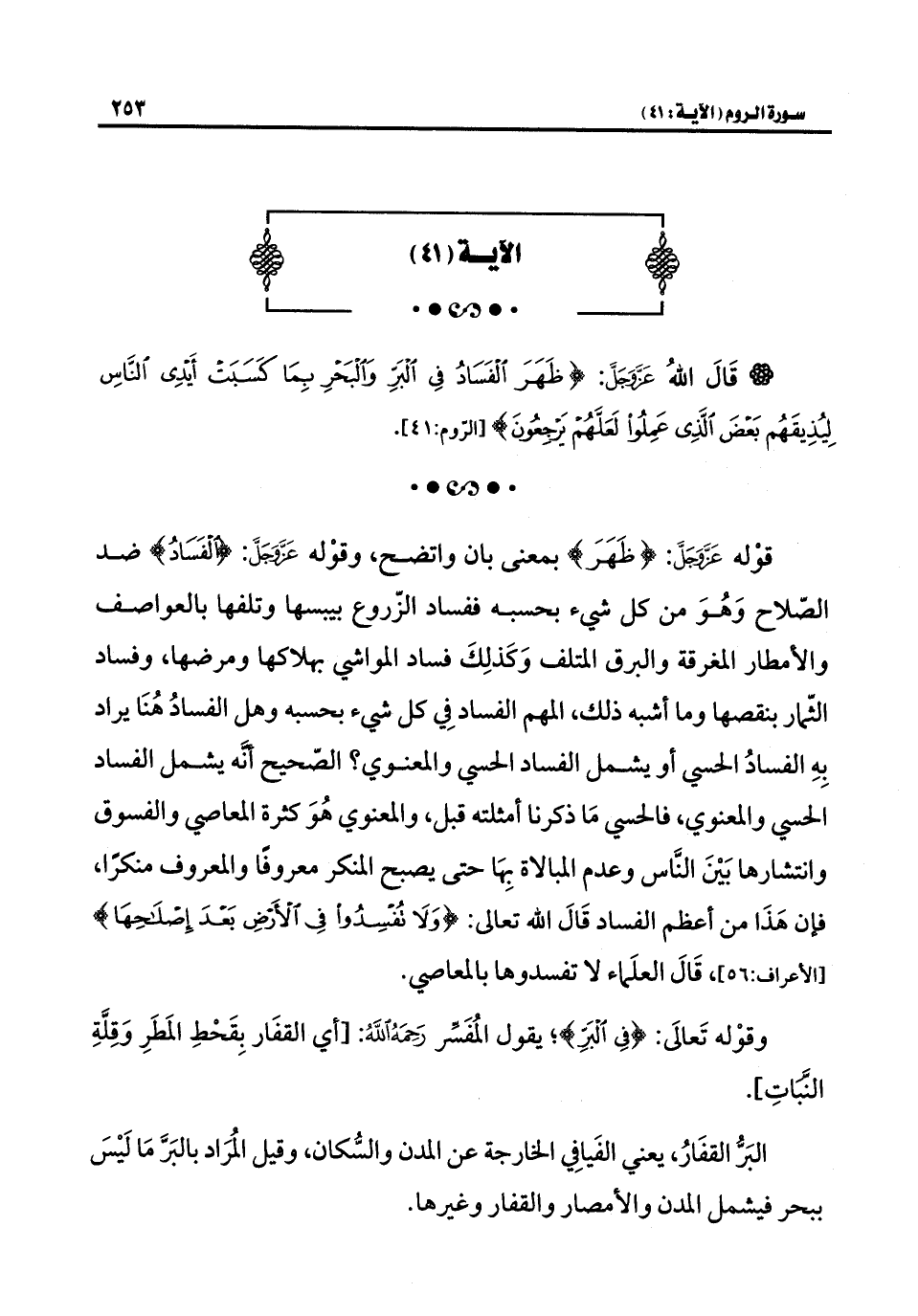 * قوْله عَزَّ وَجَلَّ: {ظَهَرَ} بمعنى بأن واتضح، وقوْله عَزَّ وَجَلَّ: {الْفَسَادُ} ضد الصّلاح وَهُوَ من كل شيء بحسبه ففساد الزّروع بيبسها وتلفها بالعواصف والأمطار المغرقة والبرق المتلف وَكَذلِكَ فساد المواشي بهلاكها ومرضها، وفساد الثّمار بنقصها وما أشبه ذلك، المهم الفساد فِي كل شيء بحسبه وهل الفسادُ هُنَا يراد بِهِ الفسادُ الحسي أو يشمل الفساد الحسي والمعنوي؟ الصّحيح أنَّه يشمل الفساد الحسي والمعنوي، فالحسي مَا ذكرنا أمثلته قبل، والمعنوي هُوَ كثرة المعاصي والفسوق وانتشارها بَيْنَ النَاس وعدم المبالاة بِهَا حتَّى يصبح المنكر معروفًا والمعروف منكرًا، فإن هَذَا من أعظم الفساد قَالَ الله تعالى: {وَلَا تُفْسِدُوا فِي الْأَرْضِ بَعْدَ إِصْلَاحِهَا} [الأعراف: ٥٦] قَالَ العلَماء لا تفسدوها بالمعاصي.