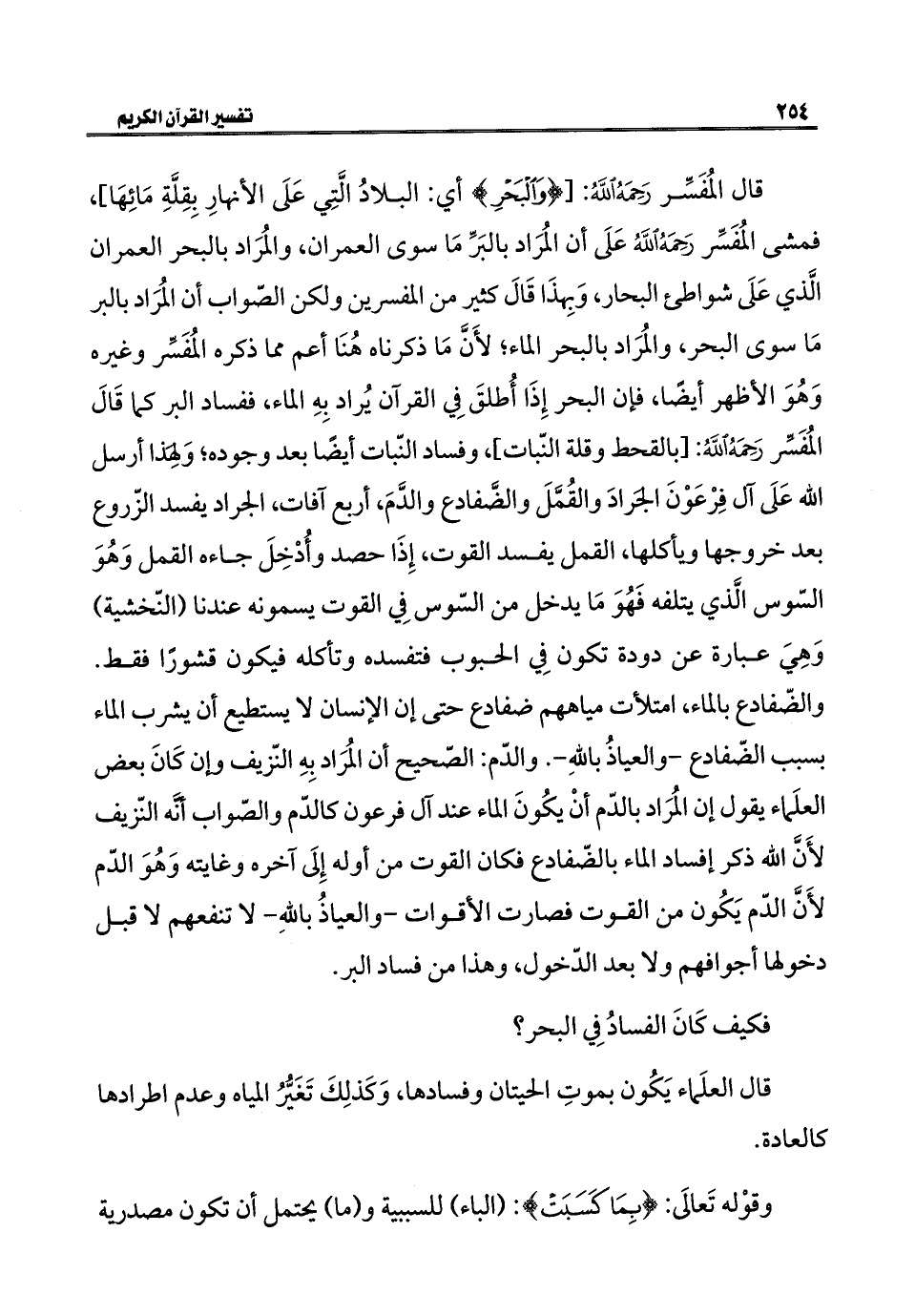 قال المُفَسِّر رَحَمَهُ اللَّهُ: [{وَالْبَحْرِ} أي: البلادُ الَّتِي عَلَى الأنهارِ بِقِلَّةِ مَائِهَا، فمشى المُفَسِّر رَحَمَهُ اللَّهُ عَلَى أن المُرَاد بالبَرِّ مَا سوى العمران، والمُرَاد بالبحر العمران الَّذي عَلَى شواطئ البحار، وَبِهذَا قَالَ كثير من المفسرين ولكن الصّواب أن المُرَاد بالبر مَا سوى البحر، والمُرَاد بالبحر الماء؛ لأَنَّ مَا ذكرناه هُنَا أعم مما ذكره المُفَسِّر وغيره وَهُوَ الأظهر أيضًا، فإن البحر إِذَا أُطلقَ فِي القرآن يُراد بِهِ الماء، ففساد البر كما قَالَ المُفَسِّر رَحَمَهُ اللَّهُ: [بالقحط وقلة النّبات] وفساد النّبات أيضًا بعد وجوده؛ وَلِهَذا أرسل الله عَلَى آل فِرْعَوْنَ الجرادَ والقُمَّلَ والضَّفادع والدَّمَ، أربع آفات، الجراد يفسد الزّروع بعد خروجها ويأكلها، القمل يفسد القوت، إِذَا حصد وأُدْخِلَ جاءه القمل وَهُوَ السّوس الَّذي يتلفه فَهُوَ مَا يدخل من السّوس فِي القوت يسمونه عندنا (النّخشية) وَهِيَ عبارة عن دودة تكون فِي الحبوب فتفسده وتأكله فيكون قشورًا فقط. والضّفادع بالماء، امتلأت مياههم ضفادع حتَّى إن الإنسان لا يستطيع أن يشرب الماء بسبب الضّفادع - والعياذُ باللهِ -. والدّم: الصّحيح أن المُرَاد بِهِ النّزيف وإن كَانَ بعض العلَماء يقول إن المُرَاد بالدّم أنْ يكُونَ الماء عند آل فرعون كالدّم والصّواب أنه النّزيف لأَن الله ذكر إفساد الماء بالضّفادع فكان القوت من أوله إِلَى آخره وغايته وَهُوَ الدّم لأَنَّ الدّم يَكُون من القوت فصارت الأقوات - والعياذُ باللهِ - لا تنفعهم لا قبل دخولها أجوافهم ولا بعد الدّخول، وهذا من فساد البر.