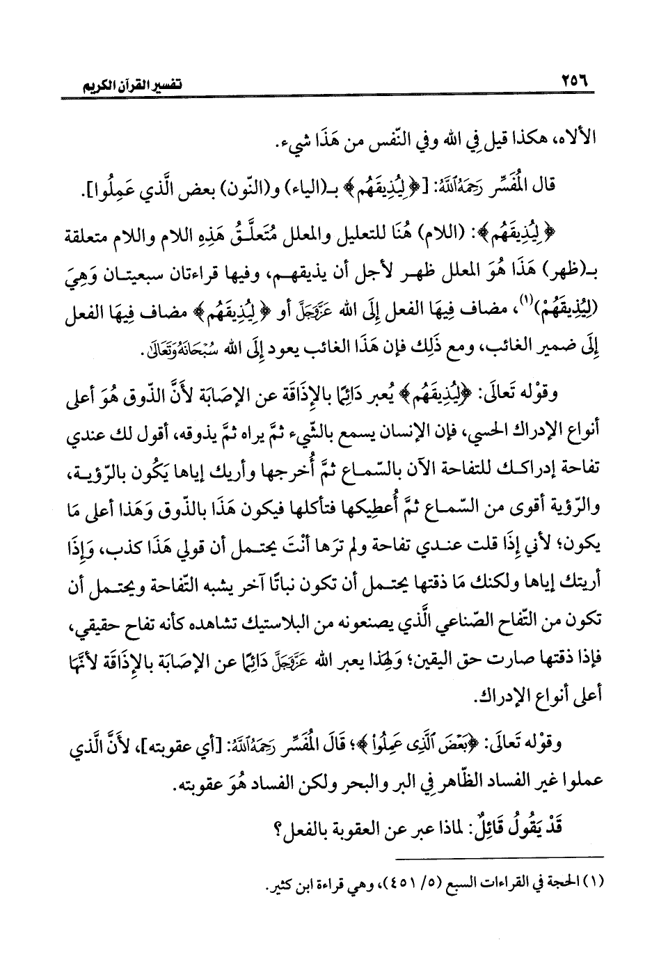 {لِيُذِيقَهُمْ}: (اللام) هُنَا للتعليل والمعلل مُتَعلَّقُ هَذِهِ اللام واللام متعلقة بـ (ظهر) هَذَا هُوَ المعلل ظهر لأجل أن يذيقهم، وفيها قراءتان سبعيتان وَهِيَ (لِيُذِيقَهُمْ) (¬١)، مضاف فِيهَا الفعل إِلَى الله عَزَّ وَجَلَّ أو {لِيُذِيقَهُمْ} مضاف فِيهَا الفعل إِلَى ضمير الغائب، ومع ذَلِك فإن هَذَا الغائب يعود إِلَى الله سُبْحَانَهُ وَتَعَالَى.