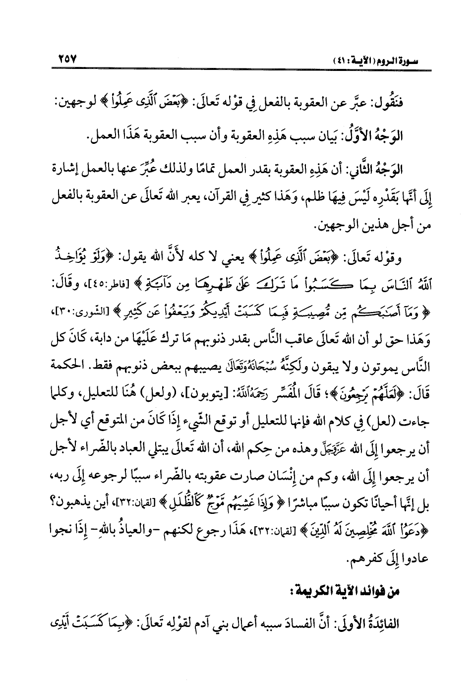 وقوْله تَعالَى: {بَعْضَ الَّذِي عَمِلُوا} يعني لا كله لأَنَّ الله يقول: {وَلَوْ يُؤَاخِذُ اللَّهُ النَّاسَ بِمَا كَسَبُوا مَا تَرَكَ عَلَى ظَهْرِهَا مِنْ دَابَّةٍ} [فاطر: ٤٥]، وقَالَ: {وَمَا أَصَابَكُمْ مِنْ مُصِيبَةٍ فَبِمَا كَسَبَتْ أَيْدِيكُمْ وَيَعْفُو عَنْ كَثِيرٍ (٣٠)} [الشورى: ٣٠] وَهَذا حق لو أن الله تَعالَى عاقب النَّاس بقدر ذنوبهم مَا ترك عَلَيْهَا من دابة، كَانَ كل النَّاس يموتون ولا يبقون ولَكِنَّهُ سُبْحَانَهُ وَتَعَالَى يصيبهم ببعض ذنوبهم فقط. الحكمة قَالَ: {لَعَلَّهُمْ يَرْجِعُونَ}؛ قَالَ المُفَسِّر رَحَمَهُ اللَّهُ: أيتوبون، (ولعل) هُنَا للتعليل، وكلما جاءت (لعل) فِي كلام الله فإنها للتعليل أو توقع الشّيء إِذَا كَانَ من المتوقع أي لأجل أن يرجعوا إِلَى الله عَزَّ وَجَلَّ وهذه من حِكم الله، أن الله تَعالَى يبتلي العباد بالضّراء لأجل أن يرجعوا إِلَى الله، وكم من إِنْسَان صارت عقوبته بالضّراء سببًا لرجوعه إِلَى ربه، بل إنَّها أحيانًا تكون سببًا مباشرًا {وَإِذَا غَشِيَهُمْ مَوْجٌ كَالظُّلَلِ} [لقمان: ٣٢]، أين يذهبون؟ {دَعَوُا اللَّهَ مُخْلِصِينَ لَهُ الدِّينَ} [لقمان: ٣٢] هَذَا رجوع لكنهم - والعياذُ باللهِ - إِذَا نجوا عادوا إِلَى كفرهم.