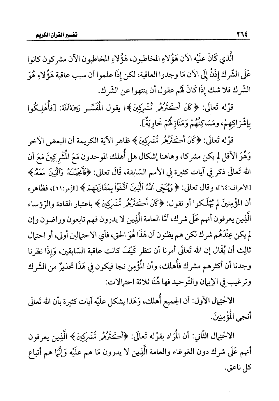 الاحْتِمال الثّاني: أن المُرَادُ بقوْله تَعالَى: {كَانَ أَكْثَرُهُمْ مُشْرِكِينَ} الَّذِين يعرفون أنهم عَلَى شرك دون الغوغاء والعامة الَّذِين لا يدرون مَا هم علَيْه وَإنَّمَا هم أتباع كل ناعق.