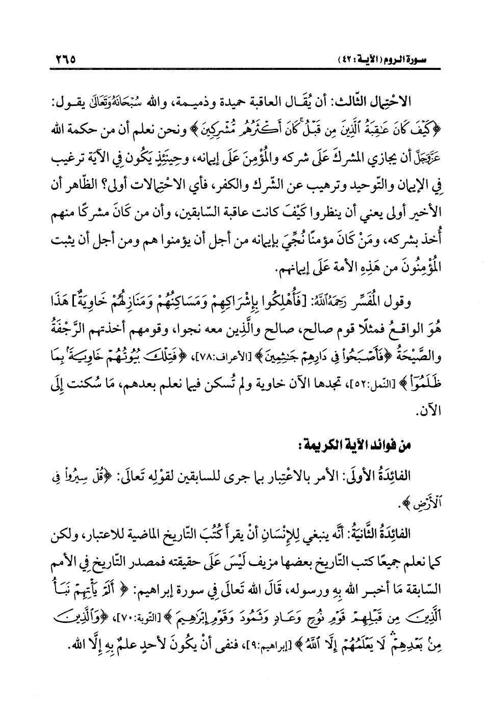 الاحْتِمال الثّالث: أن يُقَال العاقبة حميدة وذميمة، والله سُبْحَانَهُ وَتَعَالَى يقول: {كَيْفَ كَانَ عَاقِبَةُ الَّذِينَ مِنْ قَبْلُ كَانَ أَكْثَرُهُمْ مُشْرِكِينَ} ونحن نعلم أن من حكمة الله غَزَّ وَجَلَّ أن يجازي المشركَ عَلَى شركه والمُؤْمِنَ عَلَى إيمانه، وحِينَئِذٍ يَكُون فِي الآية ترغيب فِي الإيمان والتّوحيد وترهيب عن الشّرك والكفر، فأي الاحْتِمالات أولى؛ الظّاهر أن الأخير أولى يعني أن ينظروا كَيْفَ كانت عاقبة السّابقين، وأن من كَانَ مشركًا منهم أُخذ بشركه، ومَنْ كَانَ مؤمئا نُجِّيَ بإيمانه من أجل أن يؤمنوا هم ومن أجل أن يثبت المُؤْمِنُونَ من هَذِهِ الأمة عَلَى إيمانهم.