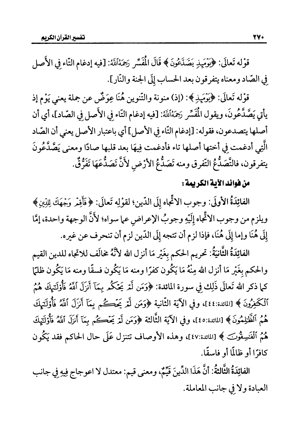 الفائِدَةُ الثَّانيَةُ: تحريم الحكم بِغَيْر مَا أنزل الله لأَنَّهُ مخالَف للاتجاه للدين القيم والحكم بِغَيْر مَا أنزل الله مِنْهُ مَا يَكُون كفرًا ومنه مَا يَكُون فسقًا ومنه مَا يَكُون ظلمًا كما ذكر الله تَعالَى ذَلِك فِي سورة المائدة: {وَمَنْ لَمْ يَحْكُمْ بِمَا أَنْزَلَ اللَّهُ فَأُولَئِكَ هُمُ الْكَافِرُونَ} [المائدة: ٤٤]، وفي الآية الثّانية {وَمَنْ لَمْ يَحْكُمْ بِمَا أَنْزَلَ اللَّهُ فَأُولَئِكَ هُمُ الظَّالِمُونَ} [المائدة: ٤٥]، وفي الآية الثَّالثة {وَمَنْ لَمْ يَحْكُمْ بِمَا أَنْزَلَ اللَّهُ فَأُولَئِكَ هُمُ الْفَاسِقُونَ} [المائدة: ٤٧]، وهذه الأوصاف تتنزل عَلَى حال الحاكم فقد يَكُون كافرًا أو ظالمًا أو فاسقًا.