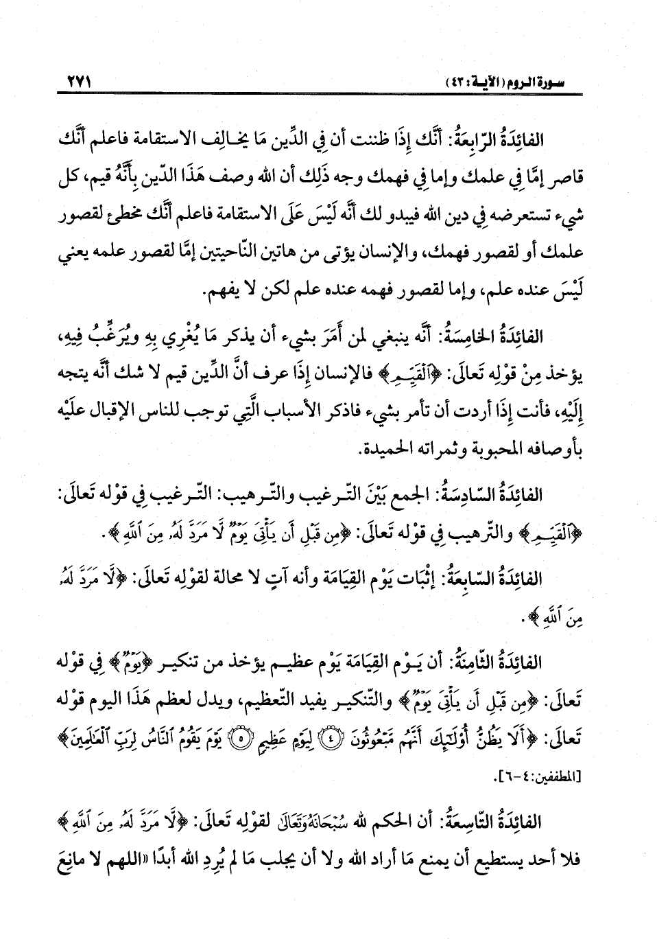 الفائِدَةُ الرابعةُ: أنَّك إِذَا ظننت أن فِي الدِّين مَا يخالِف الاستقامة فاعلم أنَّك قاصر إمَّا فِي علمك وإما فِي فهمك وجه ذَلِك أن الله وصف هَذَا الدّين بِأنَّهُ قيم، كل شيء تستعرضه فِي دين الله فيبدو لك أنَّه لَيْسَ عَلَى الاستقامة فاعلم أنَّك مخطئ لقصور علمك أو لقصور فهمك، والإنسان يؤتى من هاتين النّاحيتين إمَّا لقصور علمه يعني لَيْسَ عنده علم، وإما لقصور فهمه عنده علم لكن لا يفهم.
