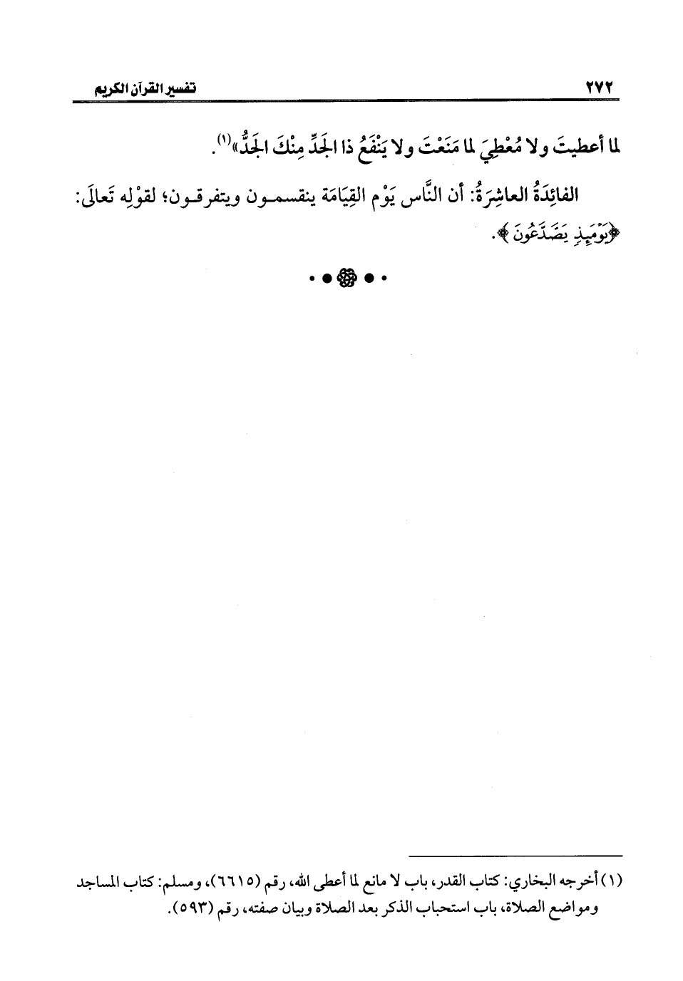 (¬١) أخرجه البخاري: كتاب القدر، باب لا مانع لما أعطى الله، رقم (٦٦١٥)، ومسلم: كتاب المساجد ومواضع الصلاة، باب استحباب الذكر بعد الصلاة وبيان صفته، رقم (٥٩٣).