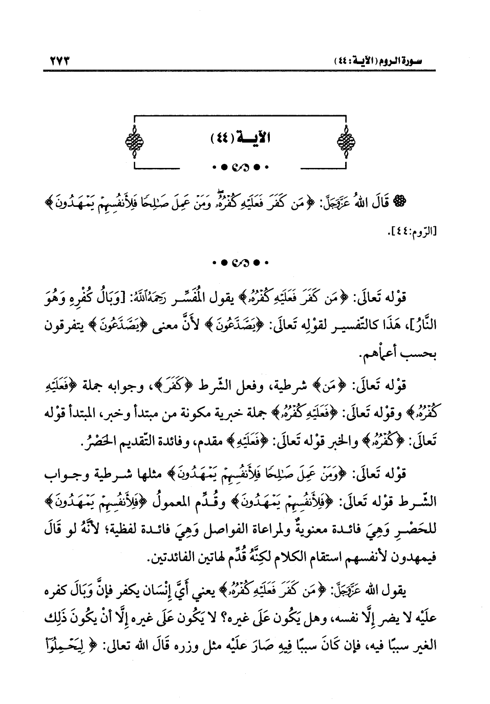 * قوْله تَعالَى: {مَنْ كَفَرَ فَعَلَيْهِ كُفْرُهُ} يقول المُفَسِّر رَحَمَهُ اللهُ: [وَبَالُ كُفْرِهِ وَهُوَ النَّارُ] هَذَا كالتّفسير لقوْلِه تَعالَى: {يَصَّدَّعُونَ} لأَنَّ معنى {يَصَّدَّعُونَ} يتفرقون بحسب أعماْهم.