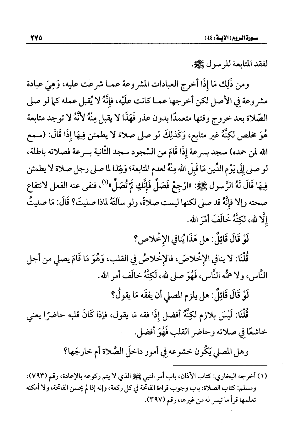 ومن ذَلِك مَا إِذَا أخرج العبادات المشروعة عما شرعت عليه، وَهِيَ عبادة مشروعة فِي الأصل لكن أخرجها عما كانت علَيْه، فإِنَّهُ لا يُقبل عمله كما لو صلى الصّلاة بعد خروج وقتها متعمدًا بدون عذر فَهَذَا لا يقبل مِنْهُ لأَنهُ لا توجد متابعة هُوَ مخلص لكِنَّهُ غير متابع، وَكَذلِكَ لو صلى صلاة لا يطمئن فِيهَا إِذَا قَالَ: (سمع الله لمن حمده) سجد بسرعة إِذَا قَامَ من السّجود سجد الثّانية بسرعة فصلاته باطلة، لو صلى إِلَى يَوْم الدّين مَا قَبِلَ الله مِنْهُ لعدم المتابعة، وَلهذا لما صلى رجل صلاة لا يطمئن فِيهَا قَالَ لَهُ الرَّسول - صلى الله عليه وسلم -: "ارْجعْ فَصَلّ فَإِنَّكِ لَمْ تُصَلّ" (¬١)، فنفى عنه الفعل لانتفاع صحته وإلَّا فإِنَّهُ قد صلى لكنها ليست صلاةً، ولو سألتَهُ لماذا صليتَ؟ قَالَ: مَا صليتُ إِلَّا لله، لكِنَّهُ خَالَفَ أمْرَ الله.