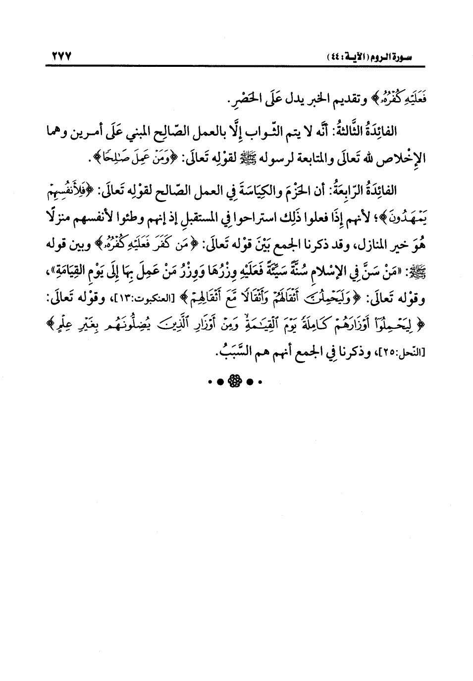 الفائِدَةُ الرابعةُ: أن الحزْمَ والكِيَاسَةَ فِي العمل الصّالح لقوْلِه تَعالَى: {فَلِأَنْفُسِهِمْ يَمْهَدُونَ}؛ لأنهم إِذَا فعلوا ذَلِك استراحوا فِي المستقبلِ إذ إنهم وطئوا لأنفسهم منزلًا هُوَ خير المنازل، وقد ذكرنا الجمع بَيْنَ قوْله تَعالَى: {مَنْ كَفَرَ فَعَلَيْهِ كُفْرُهُ} وبين قوله - صلى الله عليه وسلم -: "مَنْ سَنَّ فِي الإسْلامِ سُنَّةً سَيِّئَةً فَعَلَيْهِ وِزْرُهَا وَوِزْرُ مَنْ عَمِلَ بِهَا إِلَى يَوْمِ القِيَامَةِ"، وقوْله تَعالَى: {وَلَيَحْمِلُنَّ أَثْقَالَهُمْ وَأَثْقَالًا مَعَ أَثْقَالِهِمْ} [العنكبوت: ١٣]، وقوْله تَعالَى: {لِيَحْمِلُوا أَوْزَارَهُمْ كَامِلَةً يَوْمَ الْقِيَامَةِ وَمِنْ أَوْزَارِ الَّذِينَ يُضِلُّونَهُمْ بِغَيْرِ عِلْمٍ} [النحل: ٢٥] وذكرنا فِي الجمع أنهم هم السَّبَبُ.