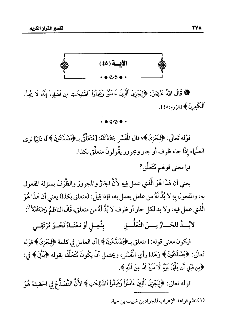 قوْله تَعالَى: {لِيَجْزِيَ}، قال المُفَسِّر رَحَمَهُ اللَّهُ: [مُتَعَلّقٌ ب {يُصَدَّعُونَ}]، دَائِمًا نرى العلَماء إِذَا جاء ظرف أو جار ومجرور يقُولونَ متعلِّق بكذا.