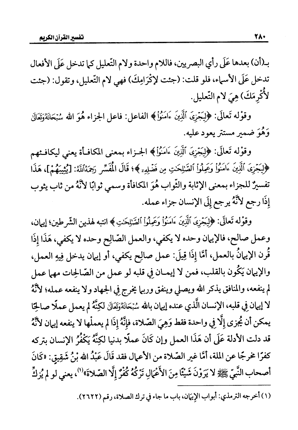 وقوْله تَعالَى: {لِيَجْزِيَ الَّذِينَ آمَنُوا وَعَمِلُوا الصَّالِحَاتِ} انتبه لهذين الشّرطين، إيمان، وعمل صالح، فالإيمان وحده لا يكفي، والعمل الصّالِح وحده لا يكفي، هَذَا إِذَا قُرن الإيمانُ بالعمل، أمَّا إِذَا قِيلَ: عمل صالِح يكفي، أو إيمان يدخل فِيهِ العمل، والإيمان يَكُون بالقلب، فمن لا إيمان فِي قلبه لو عمل من الصّالحِات مهما عمل لم ينفعه، والمنافق يذكر الله ويصلي وينفق وربما يخرج فِي الجهاد ولا ينفعه عمله، لَأنَّهُ لا إيمان فِي قلبه، الإنسان الَّذي عنده إيمان بالله سُبْحَانَهُ وَتَعَالَى لكِنَّهُ لم يعمل عملًا صالِحًا يمكن أن يُجزى إِلا فِي واحدة فقط وَهِيَ الصّلاة، فإِنَهُ إِذَا لم يعملْها لا ينفعه إيمان لأنَّهُ قد دلت الأدلة عَلَى أن هَذَا العمل وإن كَانَ عملًا بدنيا لكِنَّهُ يَكْفُرُ الإنسان بتركه كفرًا مخرجًا عن الملة، أمَّا غير الصّلاة من الأعمال فقد قَالَ عَبْدُ الله بْنُ شَقِيقٍ: "كَانَ أصحاب النَّبيِّ - صلى الله عليه وسلم - لا يَرَوْنَ شَيْئًا مِنَ الأَعْمَالِ تَرْكُهُ كُفْرٌ إِلَّا الصّلاةَ" (¬١)، يعني لو لم يُزكِّ