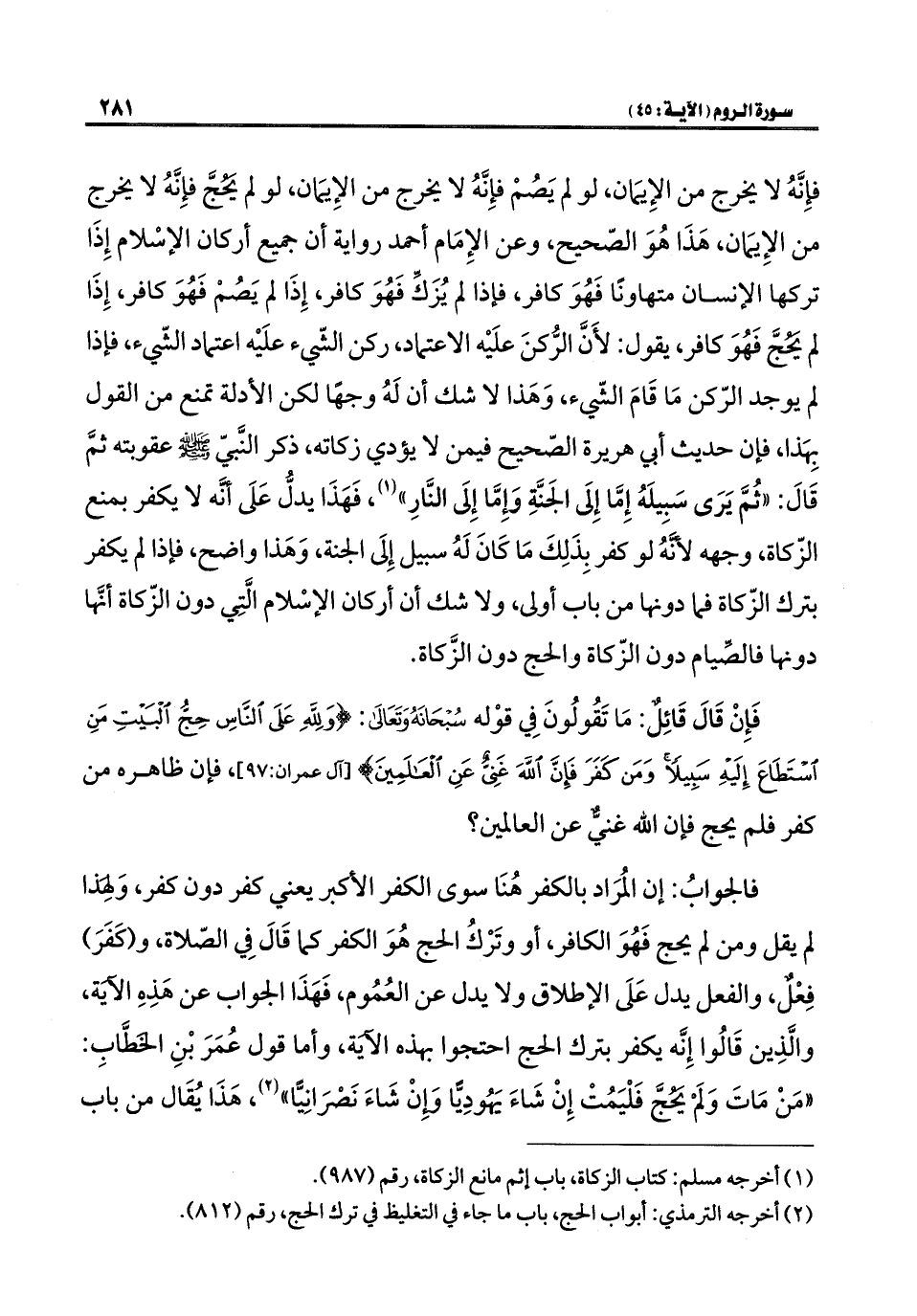 فالجوابُ: إن المُرَاد بالكفر هُنَا سوى الكفر الأكبر يعني كفر دون كفر، وَلِهَذا لم يقل ومن لم يحج فَهُوَ الكافر، أو وتَرْكُ الحج هُوَ الكفر كما قَالَ فِي الصّلاة، و (كَفَرَ) فِعْلٌ، والفعل يدل عَلَى الإطلاق ولا يدل عن العُمُوم، فَهَذَا الجواب عن هَذِهِ الآية، والَّذِين قَالُوا إِنه يكفر بترك الحج احتجوا بهذه الآية، وأما قول عُمَرَ بْنِ الخَطَّابِ: "مَنْ مَاتَ وَلَمْ يَحُجَّ فَلْيَمُتْ إِنْ شَاءَ يَهُودِيًا وَإِنْ شَاءَ نَصْرَانِيًّا" (¬٢)، هَذَا يُقَال من باب