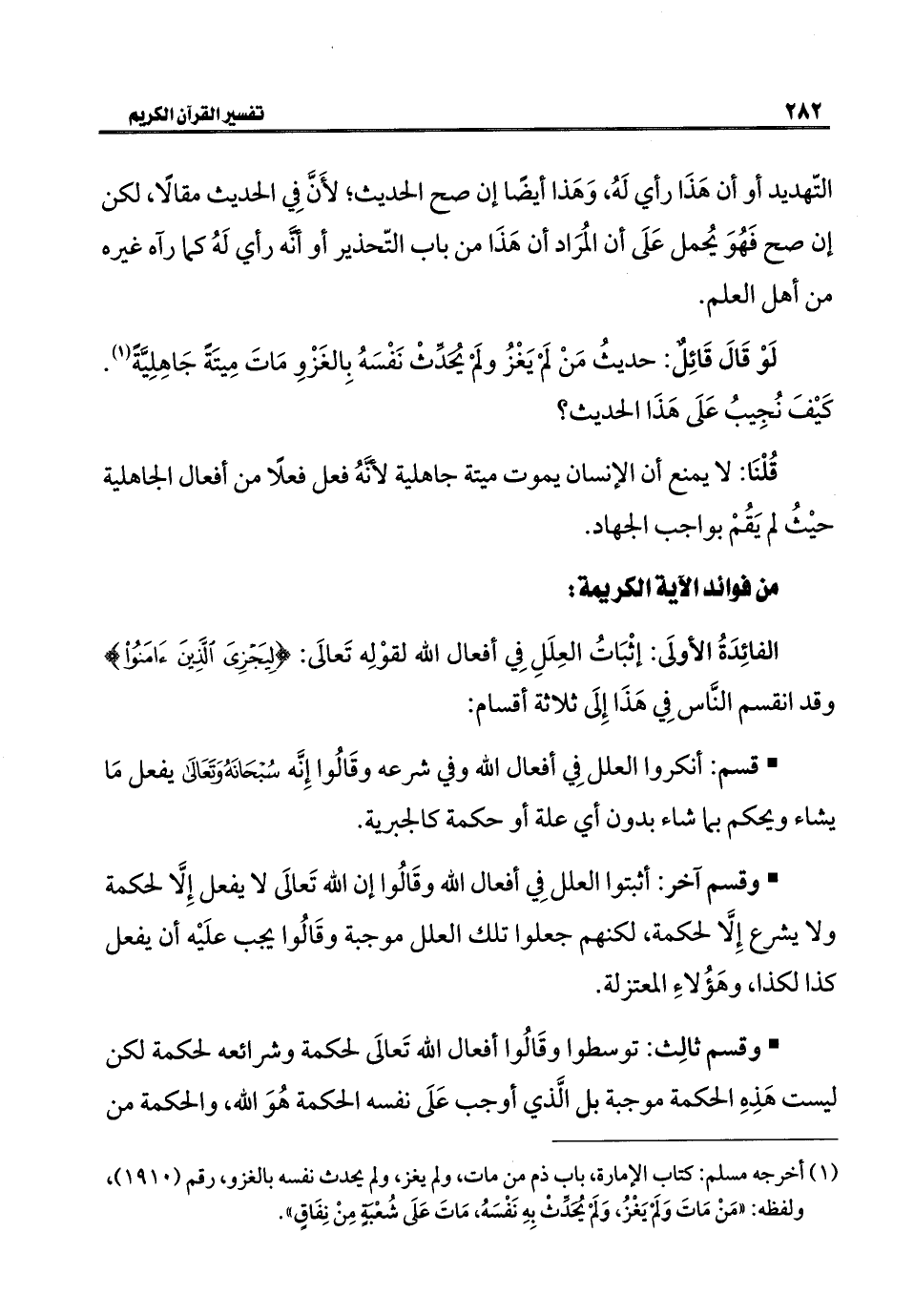 * وقسم آخر: أثبتوا العلل فِي أفعال الله وقَالُوا إن الله تَعالَى لا يفعل إِلَّا لحكمة ولا يشرع إِلَّا لحكمة، لكنهم جعلوا تلك العلل موجبة وقَالُوا يجب علَيْه أن يفعل كذا لكذا، وهَؤُلاءِ المعتزلة.