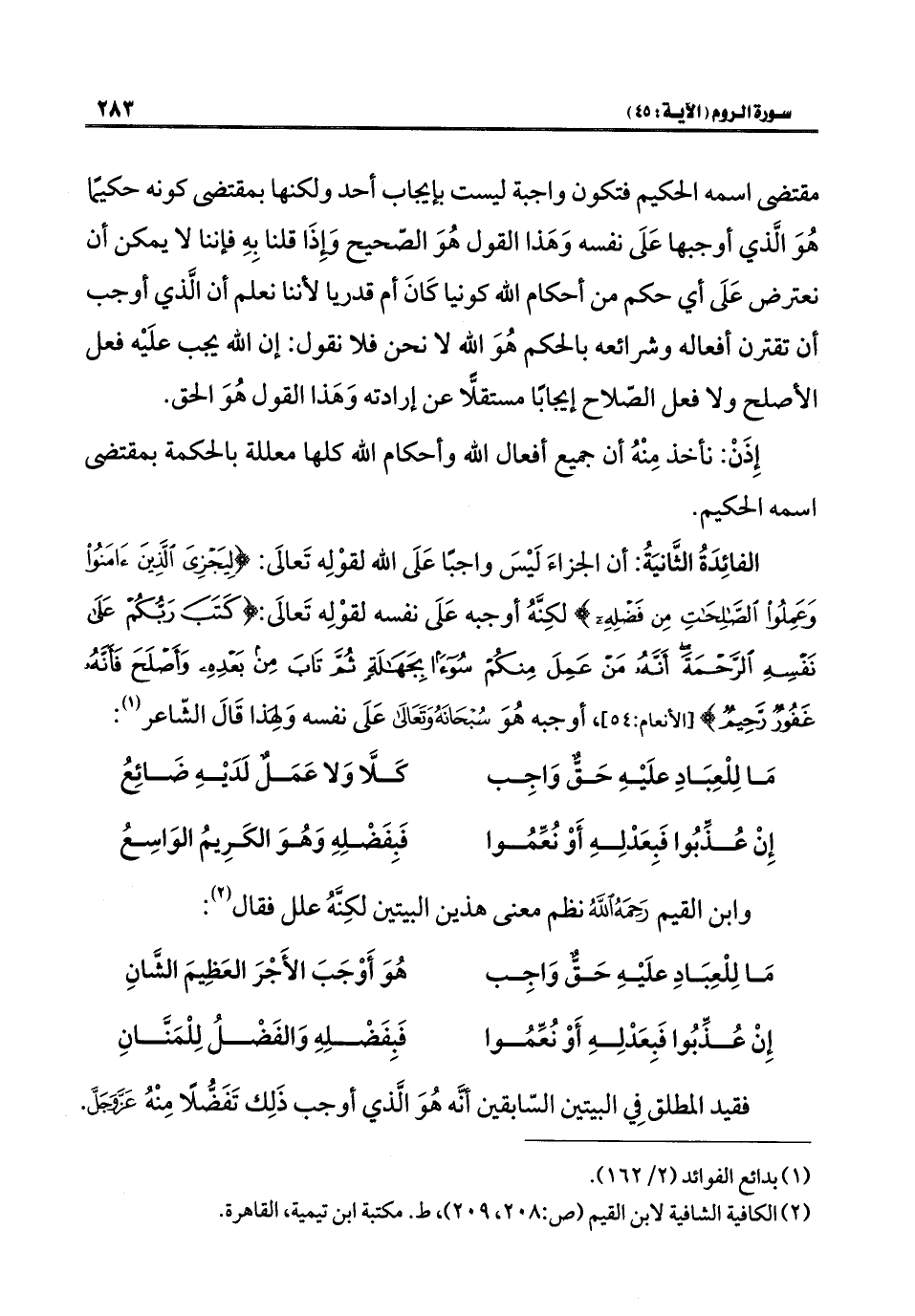 مقتضى اسمه الحكيم فتكون واجبة ليست بإيجاب أحد ولكنها بمقتضى كونه حكيمًا هُوَ الَّذي أوجبها عَلَى نفسه وَهَذا القول هُوَ الصّحيح وَإِذَا قلنا بِهِ فإننا لا يمكن أن نعترض عَلَى أي حكم من أحكام الله كونيا كَانَ أم قدريا لأننا نعلم أن الَّذي أوجب أن تقترن أفعاله وشرائعه بالحكم هُوَ الله لا نحن فلا نقول: إن الله يجب علَيْه فعل الأصلح ولا فعل الصّلاح إيجابًا مستقلًّا عن إرادته وَهَذا القول هُوَ الحق.