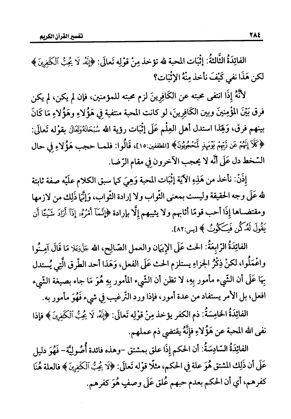 الفائِدَةُ السّادِسَةُ: أن الحكم إِذَا علق بمشتق - وهذه فائدة أُصُوليَّة - فَهُوَ دليل عَلَى أن ذَلِك المشتق هُوَ علة فِي الحكم، مثلَا قوْله تَعالَى: {لَا يُحِبُّ الْكَافِرِينَ} فالعلة هُنَا كفرهم، أي أن الحكم بعدم حبهم عُلق عَلَى وصفِ هُوَ كفرهم.