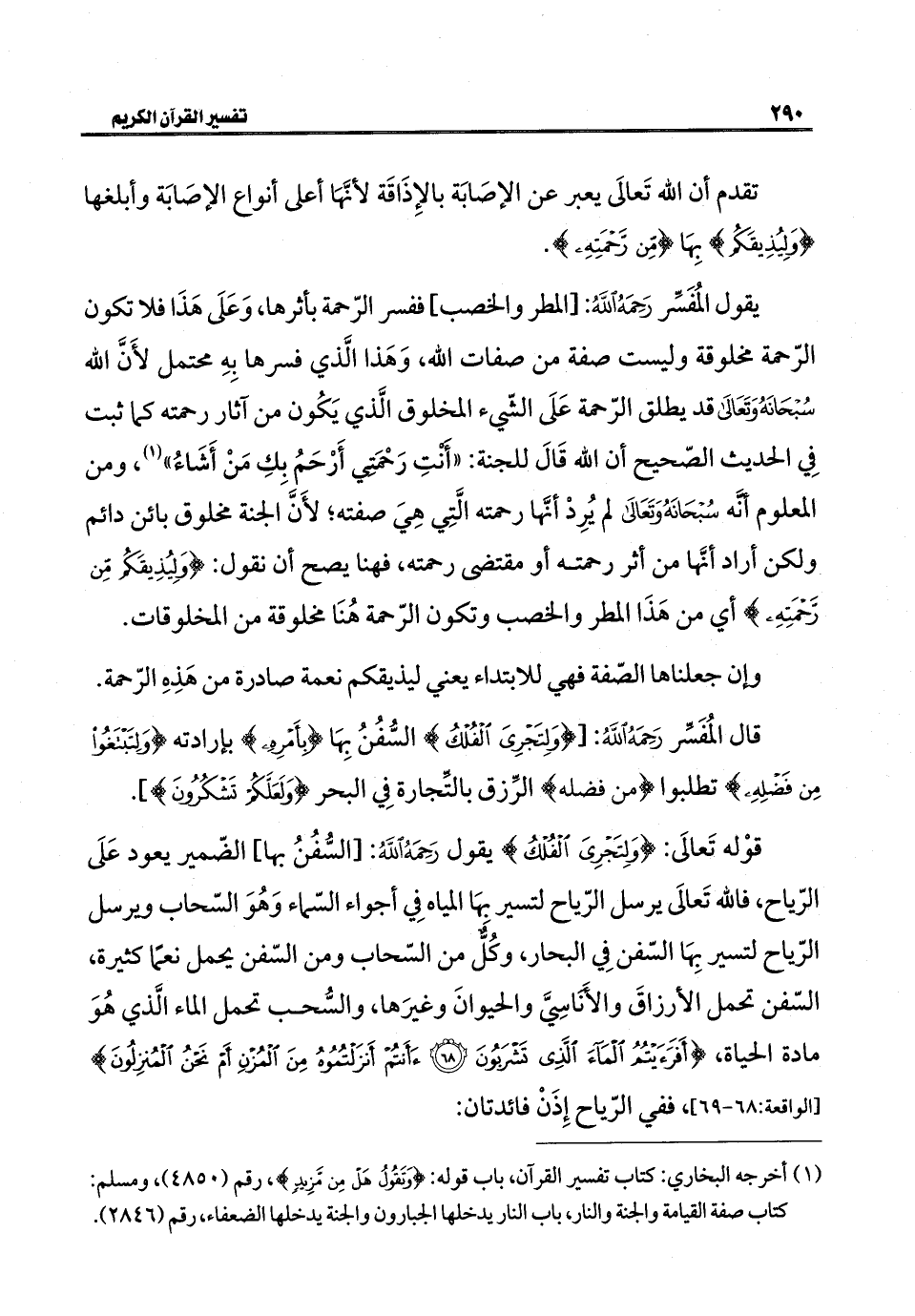 يقول المُفَسِّر رَحَمَهُ اللَّهُ: [المطر والخصب] ففسر الرّحمة بأثرها، وَعَلَى هَذَا فلا تكون الرّحمة مخلوقة وليست صفة من صفات الله، وَهَذا الَّذي فسرها بِهِ محتمل لأَنَّ الله سُبْحَانَهُ وَتَعَالَى قد يطلق الرّحمة عَلَى الشّيء المخلوق الَّذي يَكُون من آثار رحمته كما ثبت فِي الحديث الصّحيح أن الله قَالَ للجنة: "أَنْتِ رَحْمَتِي أَرْحَمُ بِكِ مَنْ أَشَاءُ" (¬١)، ومن المعلوم أنَّه سُبْحَانَهُ وَتَعَالى لم يُرِدْ أنَّها رحمته الَّتِي هِيَ صفته؛ لأَنَّ الجنَّةَ مخلوق بائن دائم ولكن أراد أنَّها من أثر رحمته أو مقتضى رحمته، فهنا يصح أن نقول: {وَلِيُذِيقَكُمْ مِنْ رَحْمَتِهِ} أي من هَذَا المطر والخصب وتكون الرّحمة هُنَا مخلوقة من المخلوقات.