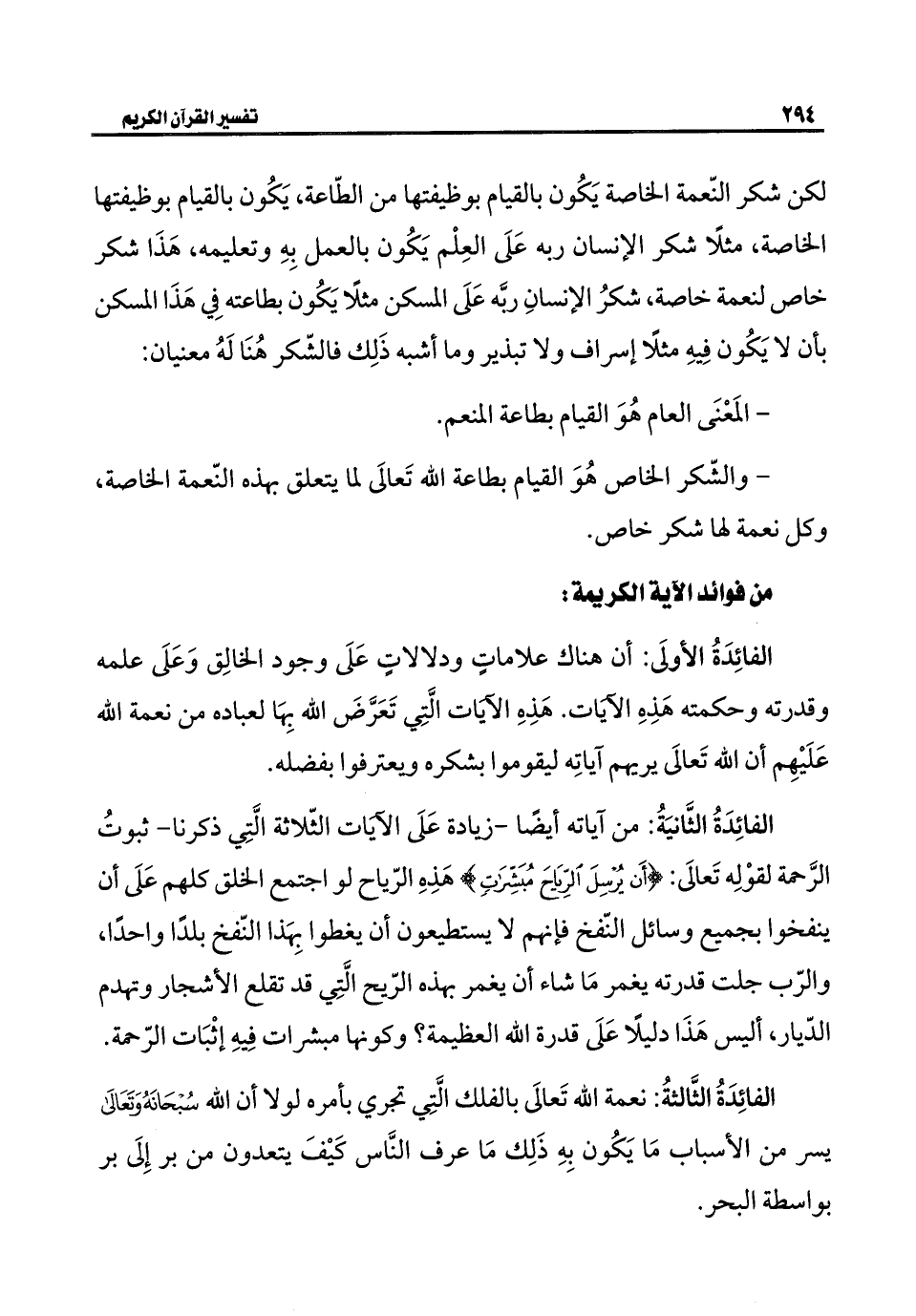 لكن شكر النّعمة الخاصة يَكُون بالقيام بوظيفتها من الطّاعة، يَكُون بالقيام بوظيفتها الخاصة، مثلًا شكر الإنسان ربه عَلَى العِلْم يَكُون بالعمل بِهِ وتعليمه، هَذَا شكر خاص لنعمة خاصة، شكرُ الإنسانِ ربَّه عَلَى المسكن مثلًا يَكُون بطاعته فِي هَذَا المسكن بأن لا يَكُون فِيهِ مثلًا إسراف ولا تبذير وما أشبه ذَلِك فالشّكر هُنَا لَهُ معنيان: