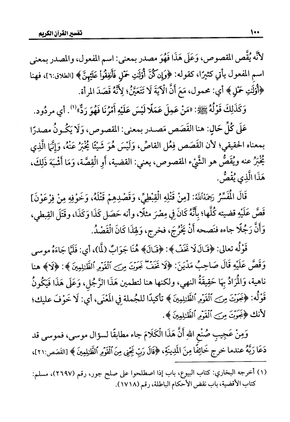 عَلَى كُلِّ حَالٍ: هنا القَصَص مَصدر بمعنى: المقصوص، وَلَا يَكُونُ مصدرًا بمعناه الحقيقي؛ لأن القَصَص فِعُل القاصِّ، وَلَيْسَ هُوَ شَيْئًا يُخْبَرُ عَنْهُ، وَإِنَّمَا الَّذِي يُخْبَرُ عنه ويُقَصُّ هو الشَّيْء المقصوص، يعني: القضية، أَوِ الْقِصَّة، وَمَا أَشْبَهَ ذَلِكَ، هَذَا الَّذِي يُقْصُّ.
