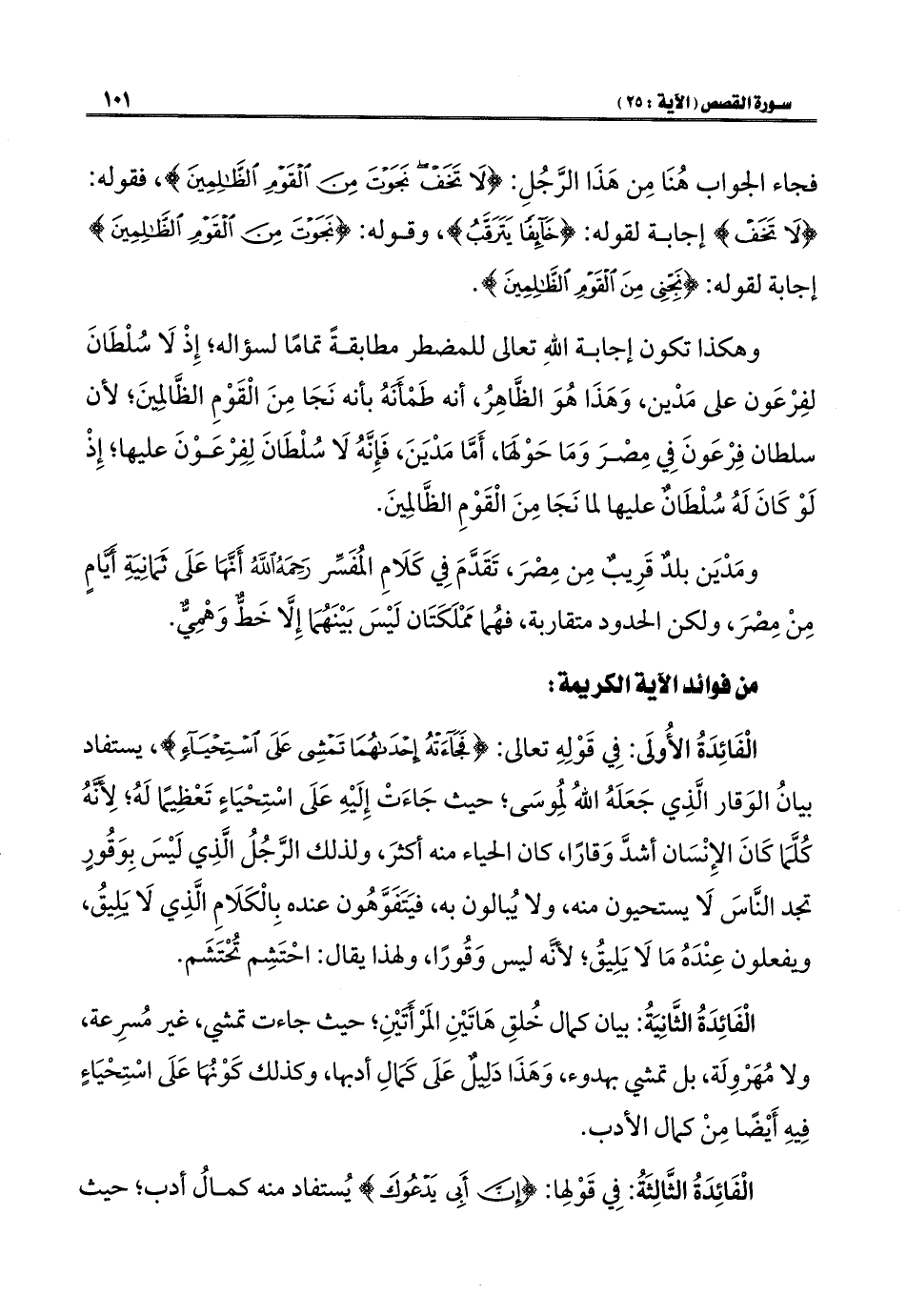 وهكذا تكون إجابة اللَّهِ تعالى للمضطر مطابقةً تمامًا لسؤاله؛ إِذْ لَا سُلْطَانَ لفِرْعَون على مَدْين، وَهَذَا هُوَ الظَّاهِرُ، أنه طَمْأنَهُ بأنه نَجَا مِنَ الْقَوْمِ الظَّالِمينَ؛ لأن سلطان فِرْعَونَ فِي مِصْرَ وَمَا حَوْلَهَا، أَمَّا مَدْيَنَ، فَإِنَّهُ لَا سُلْطَانَ لِفِرْعَوْنَ عليها؛ إِذْ لَوْ كَانَ لَهُ سُلْطَانٌ عليها لما نَجَا مِنَ الْقَوْمِ الظَّالمِينَ.