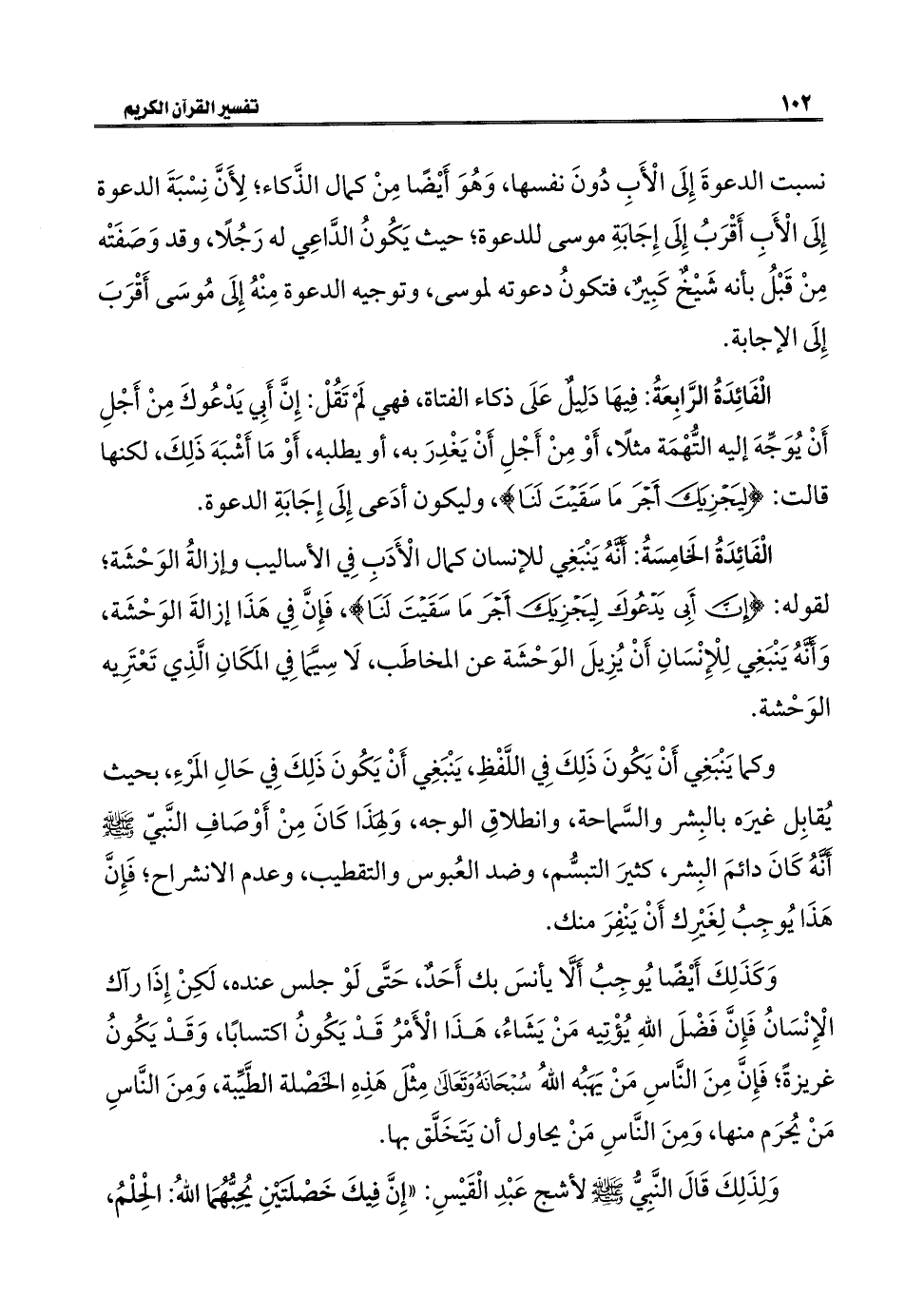 الْفَائِدَةُ الخَامِسَةُ: أَنَّهُ يَنْبَغِي للإنسان كمال الْأَدَبِ فِي الأساليب وإزالةُ الوَحْشَة؛ لقوله: {أَبِي يَدْعُوكَ لِيَجْزِيَكَ أَجْرَ مَا سَقَيْتَ لَنَا}، فَإِنَّ فِي هَذَا إزالةَ الوَحْشَة، وَأَنَّهُ يَنْبَغِي لِلْإِنْسَانِ أَنْ يُزِيلَ الوَحْشَة عن المخاطَب، لَا سِيَّمَا فِي المَكَانِ الَّذِي تَعْتَرِيه الوَحْشة.