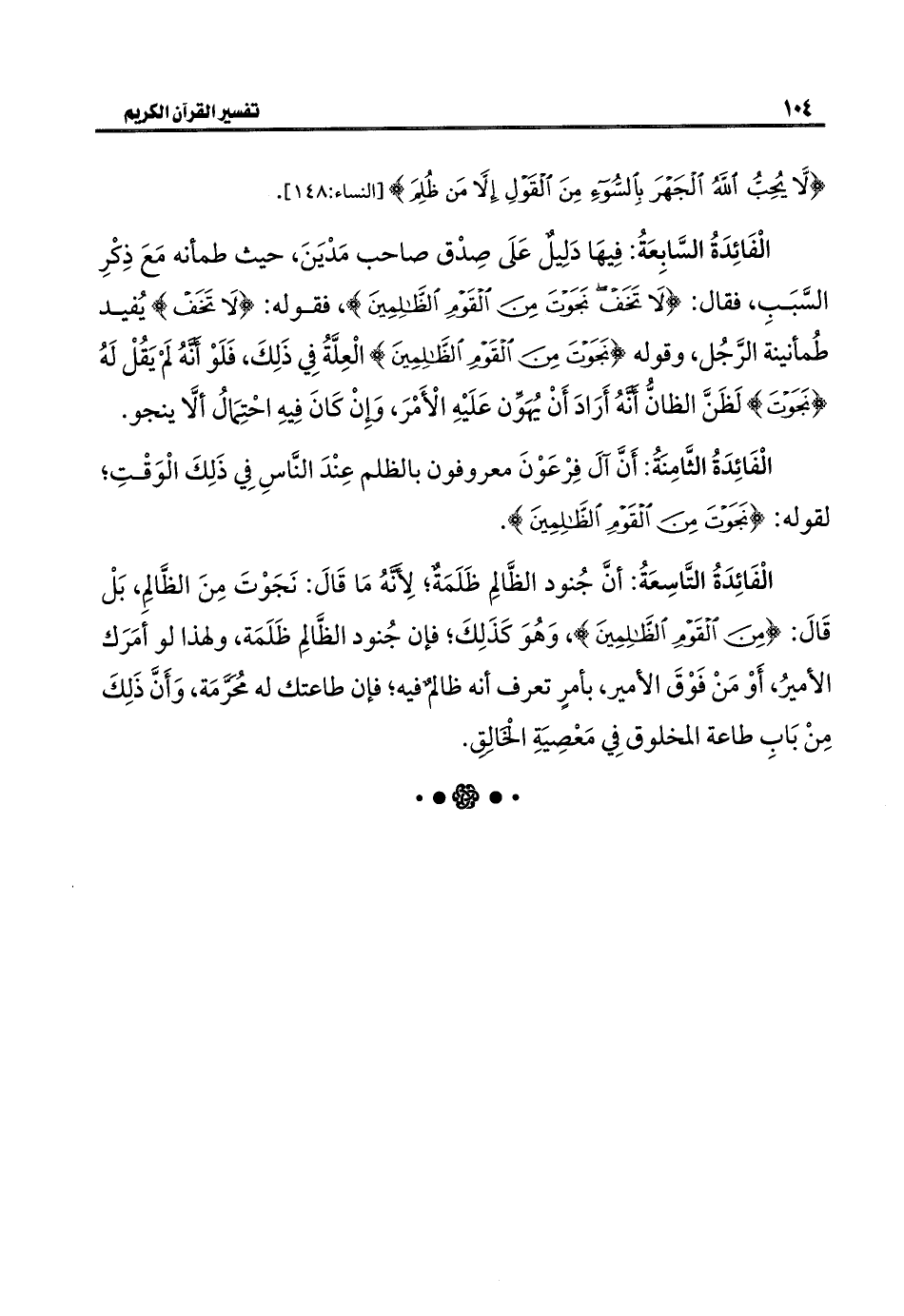 الْفَائِدَةُ التَّاسِعَةُ: أنَّ جُنود الظَّالِم ظَلَمَةٌ؛ لِأَنَّهُ مَا قَالَ: نَجَوْتَ مِنَ الظَّالِمِ، بَلْ قَالَ: {مِنَ الْقَوْمِ الظَّالِمِينَ}، وَهُوَ كَذَلِكَ؛ فإن جُنود الظَّالِم ظَلَمَة، ولهذا لو أمَرَك الأميرُ، أَوْ مَنْ فَوْقَ الأمير، بأمرٍ تعرف أنه ظالمٌ فيه؛ فإن طاعتك له مُحَرَّمَة، وَأَنَّ ذَلِكَ مِنْ بَابِ طاعة المخلوق فِي مَعْصِيَةِ الْخَالِق.