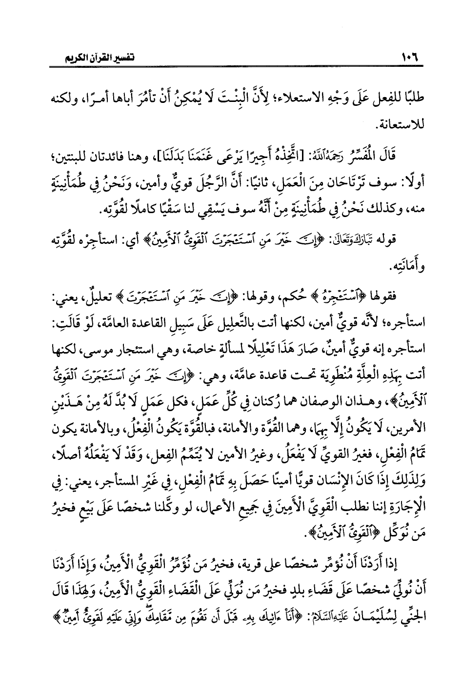 فقولها {اسْتَأْجِرْهُ} حُكم، وقولها: {إِنَّ خَيْرَ مَنِ اسْتَأْجَرْتَ} تعليلٌ، يعني: استأجره؛ لأنَّه قويٌّ أمين، لكنها أتت بالتَّعلِيل عَلَى سَبِيلِ القاعدة العامَّة، لَوْ قَالَتِ: استأجره إنه قويٌّ أمينٌ، صَارَ هَذَا تَعْلِيلًا لمسألةٍ خاصة، وهي استئجار موسى، لكنها أتت بِهَذِهِ الْعِلَّةِ مُنْطَوِيَة تحت قاعدة عامَّة، وهي: {إِنَّ خَيْرَ مَنِ اسْتَأْجَرْتَ الْقَوِيُّ الْأَمِينُ}، وهذان الوصفان هما رُكنان فِي كُلِّ عَمَلٍ، فكل عَمَلٍ لابدَّ لَهُ مِنْ هَذَيْنِ الأمرين، لَا يَكُونُ إِلَّا بِهِما، وهما القُوَّة والأمانة، فبالقُوَّة يَكُونُ الْفِعْلُ، وبالأمانة يكون تَمَامُ الْفِعْلِ، فغيرُ القويِّ لَا يَفْعَلُ، وغيرُ الأمين لا يُتَمِّمُ الفِعل، وَقَدْ لَا يَفْعَلُهُ أصلًا، وَلذَلِكَ إِذَا كَانَ الإِنْسَان قويًّا أمينًا حَصَلَ بِهِ تَمَامُ الْفِعْلِ، فِي غَيْرِ المستأجر، يعني: فِي الْإِجَارَةِ إننا نطلب الْقَوِيَّ الْأَمِينَ فِي جَمِيعِ الأعمال، لو وكَّلنا شخصًا عَلَى بَيْعٍ فخيرُ مَن نُوَكِّل {الْقَوِيُّ الْأَمِينُ}.
