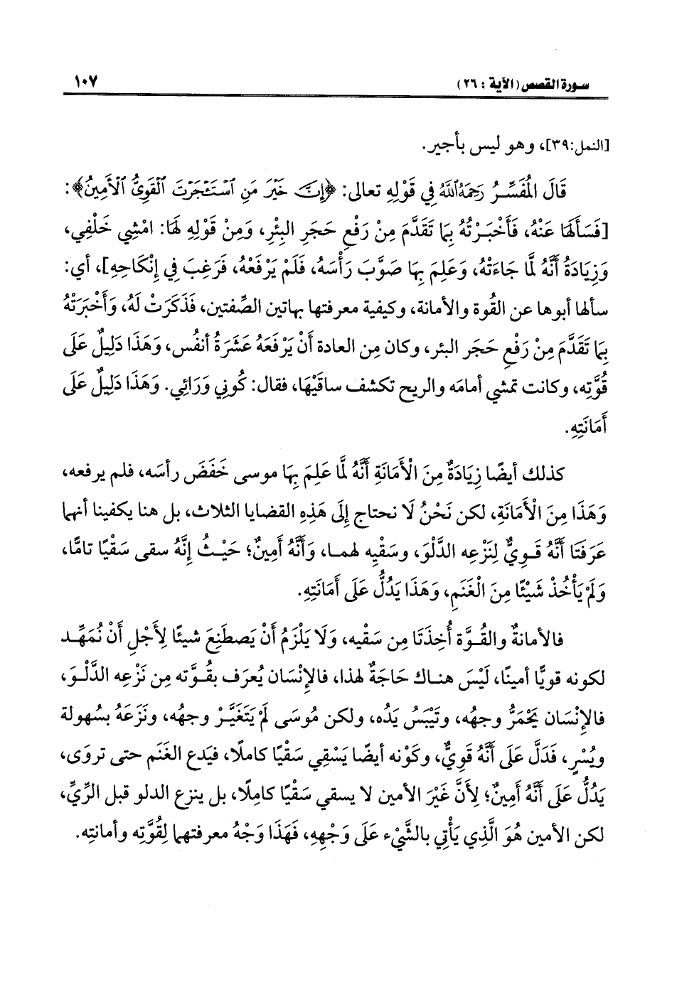 قَالَ المُفَسِّرُ رَحِمَهُ اللَّهُ فِي قَوْلِهِ تعالى: {إِنَّ خَيْرَ مَنِ اسْتَأْجَرْتَ الْقَوِيُّ الْأَمِينُ}: [فَسَأَلَهَا عَنْهُ، فَأَخْبَرتُهُ بِمَا تَقَدَّمَ مِنْ رَفْعِ حَجَرِ البِئْرِ، وَمِنْ قَوْلِهِ لَهَا: امْشِي خَلْفِي، وَزَيادَةُ أَنَّهُ لمَّا جَاءَتْهُ، وَعَلِمَ بِهَا صَوَّبَ رَأْسَهُ، فَلَمْ يَرْفَعْهُ، فَرَغِبَ فِي إِنْكَاحِهِ]، أي: سألها أبوها عن القُوة والأمانة، وكيفية معرفتها بهاتين الصِّفتين، فَذَكَرَتْ لَهُ، وَأَخْبَرَتْهُ بِمَا تَقَدَّمَ مِنْ رَفْعِ حَجَر البئر، وكان مِن العادة أَنْ يَرْفَعَهُ عَشَرَةُ أنفُس، وَهَذَا دَلِيلٌ عَلَى قُوَّتِه، وكانت تمشي أمامَه والريح تكشف ساقَيْهَا، فقال: كُونِي وَرَائِي. وَهَذَا دَليلٌ عَلَى أَمَانَتِهِ.