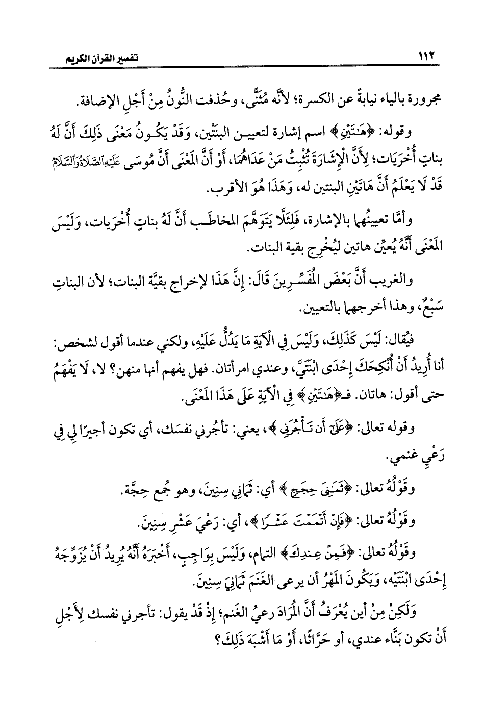 فيُقال: لَيْسَ كَذَلِكَ، وَلَيْسَ فِي الآيَةِ مَا يَدُلُّ عَلَيْهِ، ولكني عندما أقول لشخص: أنا أُرِيدُ أَنْ أُنكِحَكَ إِحْدَى ابْنَتَيَّ، وعندي امرأتان. فهل يفهم أنها منهن؟ لا، لَا يَفْهَمُ حتى أقول: هاتان. فـ {هَاتَيْنِ} فِي الآيَةِ عَلَى هَذَا المَعْنَى.