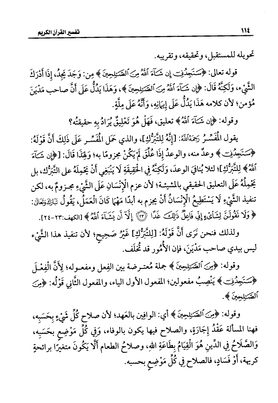 يقول المُفَسِّرُ رَحِمَهُ اللَّهُ: [إِنَّهُ لِلتَّبَرُّكِ]، والذي حَمَل المُفَسِّر عَلَى ذَلِكَ أَنَّ قَوْلَهُ: {سَتَجِدُنِي} وعدٌ منه، والوعدُ إِذَا عُلِّقَ لَمْ يَكُنْ مجزومًا به؛ وَلِهَذَا قَالَ: [{إِنْ شَاءَ اللَّهُ} لِلتَّبَرُّكِ]؛ لئلا يُنافيَ الوعدَ، وَلَكِنَّهُ فِي الحقِيقَةِ لَا يَنْبَغِي أَنْ يَحْمِلَهُ على التَّبَرُّك، بل يَحْمِلُهُ عَلَى التعليق الحقيقي بالمشيئة؛ لأن عزم الْإِنْسَانِ عَلَى الشَّيْءِ مجزومٌ به، لكن تنفيذ الشَّيْءِ لَا يَسْتَطِيعُ الْإِنْسَانُ أَنْ يجزم به أبدًا مَهْمَا كَانَ الْعَمَلُ، يَقُولُ تَبَارَكَ وَتَعَالَى: {وَلَا تَقُولَنَّ لِشَيْءٍ إِنِّي فَاعِلٌ ذَلِكَ غَدًا (٢٣) إِلَّا أَنْ يَشَاءَ اللَّهُ} [الكهف: ٢٣ - ٢٤].