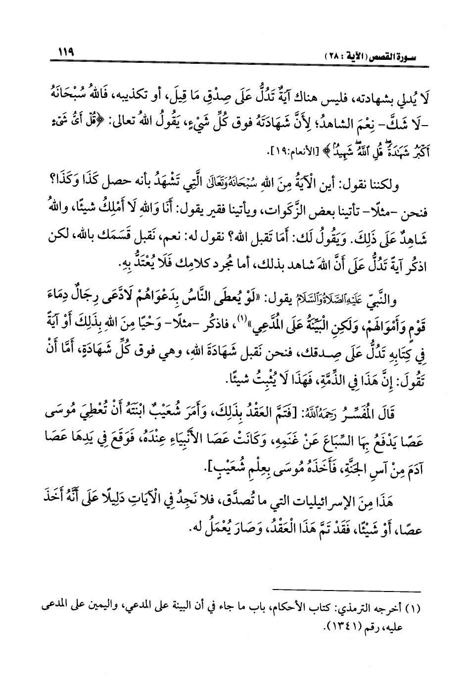 ولكننا نقول: أين الآيَةُ مِنَ اللَّهِ سُبْحَانَهُ وَتَعَالَى الَّتِي تَشْهَدُ بأنه حصل كَذَا وَكَذَا؟ فنحن -مثلًا- تأتينا بعض الزَّكَوات، ويأتينا فقير يقول: أَنَا وَاللَّهِ لَا أَمْلِكُ شيئًا، واللَّهُ شَاهِدٌ عَلَى ذَلِكَ. وَيَقُولُ لَك: أَمَا تَقبل اللَّه؟ نقول له: نعم، نَقبل قَسَمَك باللَّه، لكن اذكُر آيةً تَدُلُّ عَلَى أَنَّ اللَّهَ شاهد بذلك، أما مُجرد كلامِك فَلَا يُعْتَدُّ بِهِ.