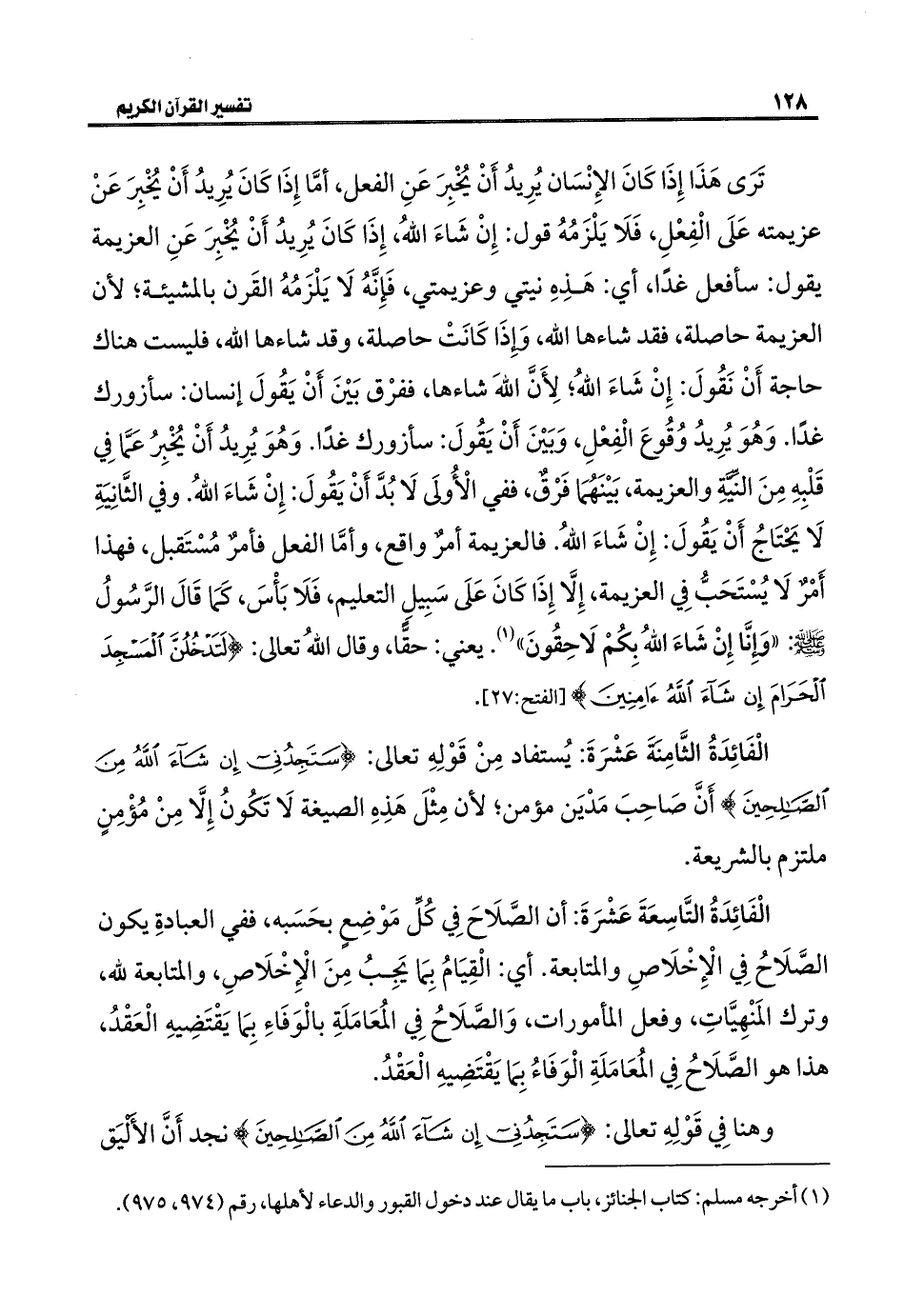 ترَى هَذَا إِذَا كَانَ الإِنْسَان يُرِيدُ أَنْ يُخْبِرَ عَنِ الفعل، أمَّا إِذَا كَانَ يُرِيدُ أَنْ يُخْبِرَ عَنْ عزيمته عَلَى الْفِعْلِ، فَلَا يَلْزَمُهُ قول: إِنْ شَاءَ اللَّهُ، إِذَا كَانَ يُرِيدُ أَنْ يُخْبِرَ عَنِ العزيمة يقول: سأفعل غدًا، أي: هَذِهِ نيتي وعزيمتي، فَإِنَّهُ لَا يَلْزَمُهُ القَرن بالمشيئة؛ لأن العزيمة حاصلة، فقد شاءها اللَّه، وَإِذَا كَانَتْ حاصلة، وقد شاءها اللَّه، فليست هناك حاجة أَنْ نَقُولَ: إِنْ شَاءَ اللَّهُ؛ لِأَنَّ اللَّهَ شاءها، ففرْق بَيْنَ أَنْ يَقُولَ إنسان: سأزورك غدَا. وَهُوَ يُرِيدُ وُقُوعَ الْفِعْلِ، وَبَيْنَ أَنْ يَقُولَ: سأزورك غدًا. وَهُوَ يُرِيدُ أَنْ يُخْبِرُ عَمَّا فِي قَلْبِهِ مِنَ النِّيَّةِ والعزيمة، بَيْنَهُمَا فَرْقٌ، ففي الْأُولَى لَا بُدَّ أَنْ يَقُولَ: إِنْ شَاءَ اللَّهُ. وفي الثَّانِيَةِ لَا يَحْتَاجُ أَنْ يَقُولَ: إِنْ شَاءَ اللَّهُ. فالعزيمة أمرٌ واقع، وأمَّا الفعل فأمرٌ مُسْتَقبل، فهذا أَمْرٌ لَا يُسْتَحَبُّ فِي العزيمة، إِلَّا إِذَا كَانَ عَلَى سَبِيلِ التعليم، فَلَا بَأْسَ، كَمَا قَالَ الرَّسُولُ -صلى اللَّه عليه وسلم-: "وَإِنَّا إِنْ شَاءَ اللَّهُ بِكُمْ لَاحِقُونَ" (¬١). يعني: حقًّا، وقال اللَّهُ تعالى: {لَتَدْخُلُنَّ الْمَسْجِدَ الْحَرَامَ إِنْ شَاءَ اللَّهُ آمِنِينَ} [الفتح: ٢٧].