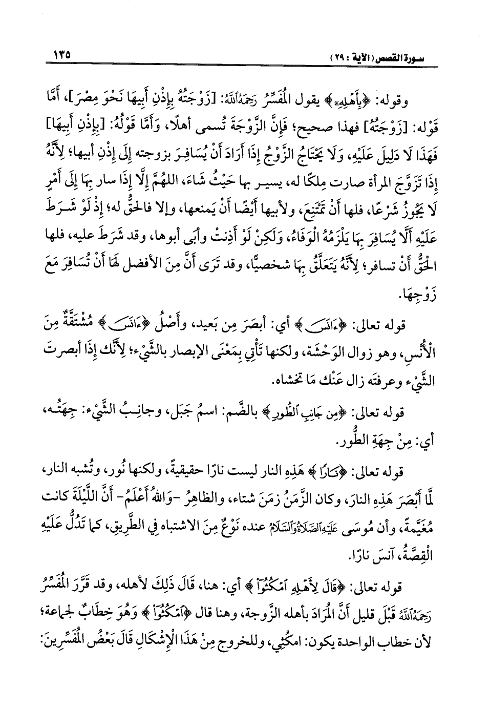 وقوله: {بِأَهْلِهِ} يقول المُفَسِّرُ رَحِمَهُ اللَّهُ: [زَوْجَتُهُ بِإِذْنِ أَبِيهَا نَحْوَ مِصْرَ]، أَمَّا قَوْله: [زَوْجَتُهُ] فهذا صحيح؛ فَإِنَّ الزَّوْجَةَ تُسمى أهلًا، وَأَمَّا قَوْلُهُ: [بِإِذْنِ أَبِيهَا] فَهَذَا لَا دَلِيلَ عَلَيْهِ، وَلَا يَحْتَاجُ الزَّوْجُ إِذَا أَرَادَ أَنْ يُسَافِرَ بزوجته إِلَى إِذْنِ أبيها؛ لِأَنَّهُ إِذَا تَزَوَّجَ المرأة صارت مِلكًا له، يسير بها حَيْثُ شَاءَ، اللهُمَّ إِلَّا إِذَا سار بِهَا إِلَى أَمْرٍ لَا يَجُوزُ شَرْعًا، فلها أَنْ تَمْتَنِعَ، ولأبيها أَيْضًا أَنْ يَمنعها، وإلا فالحقُّ له؛ إِذْ لَوْ شَرَطَ عَلَيْهِ أَلا يُسَافِرَ بِهَا يَلْزَمُهُ الْوَفَاءُ، وَلَكِنْ لَوْ أَذِنتْ وأبَى أبوها، وقد شَرَطَ عليه، فلها الْحَقُّ أَنْ تسافر، لأَنَّهُ يَتَعَلَّقُ بِهَا شخصيًّا، وقد تَرَى أَنَّ مِنَ الأفضل لَهَا أَنْ تُسَافِرَ مَعَ زَوْجِهَا.