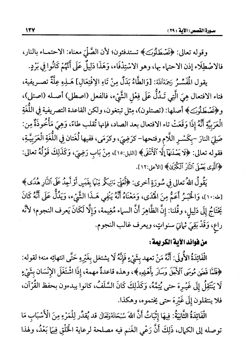 يقول المُفَسِّرُ رَحِمَهُ اللَّهُ: [وَالطَّاءُ بَدَلٌ مِنْ تَاءِ الِافْتِعَالِ] هَذِهِ عِلَّةٌ تصريفية، فتاء الافتعال هِيَ الَّتِي تَدُلُّ عَلَى فِعْلِ الشَّيْء، فالفعل (اصطلى) أصله (اصتلى)، و {تَصْطَلُونَ} أصلها: (تصتلون)، مِثل تبتغون، ولكن القاعدة التصريفية فِي اللُّغَةِ الْعَرَبِيَّةِ أَنَّهُ إِذَا وَقَعَتْ تاء الافتعال بعد الصاد، فإنها تُقلب طاءً، وَهِيَ مَأْخُوذَةٌ مِن: صَليَ النارَ -بِكَسْرِ اللَّامِ وفتحها- كرَضِيَ، وكرَمَى، ففيها لُغَتان فِي اللُّغَةِ الْعَرَبِيَّةِ، فقوله تعالى: {لَا يَصْلَاهَا إِلَّا الْأَشْقَى} [الليل: ١٥]، مِنْ بَابِ رَضِيَ، وَكَذَلِكَ قَوْلُهُ تعالى: {الَّذِي يَصْلَى النَّارَ الْكُبْرَى} [الأعلى: ١٢].