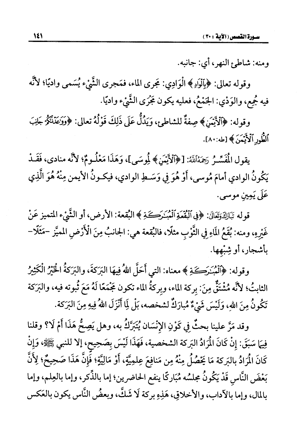 يقول المُفَسِّرُ رَحِمَهُ اللَّهُ: [{الْأَيْمَنَ} لِمُوسَى]، وَهَذَا مَعْلُومٌ؛ لأنَّه منادى، فَقَدْ يَكُونُ الوادي أمامَ مُوسى، أَوْ هُوَ فِي وَسَطِ الوادي، فيكونُ الأيمن مِنْهُ هُوَ الَّذِي عَلَى يَمِينِ موسى.