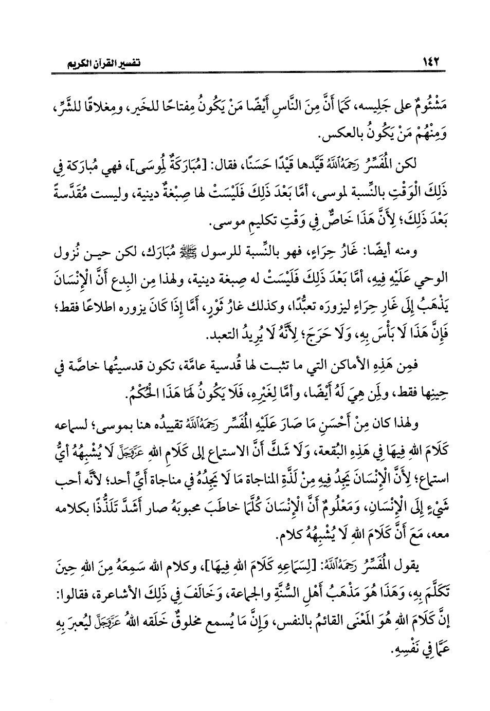 ولهذا كان مِنْ أَحْسَنِ مَا صَارَ عَلَيْهِ المُفَسِّر رَحِمَهُ اللَّهُ تقييدُه هنا بموسى؛ لسماعه كَلَامَ اللَّهِ فِيهَا فِي هَذِهِ البُقعة، وَلَا شَكَّ انَّ الاستماع إلى كَلَامِ اللَّهِ عَزَّ وَجَلَّ لَا يُشْبِهُهُ أيُّ استماع؛ لِأَنَّ الْإِنْسَانَ يَجِدُ فِيهِ مِنْ لَذَّةِ المناجاة مَا لَا يَجِدُهُ في مناجاة أَيِّ أحد؛ لأنَّه أحب شَيْءٍ إِلَى الْإِنْسَانِ، وَمَعْلُومٌ أَنَّ الْإِنْسَانَ كُلَّمَا خاطَبَ محبوبَهُ صار أَشَدَّ تَلَذُّذًا بكلامه معه، مَعَ أَنَّ كَلَامَ اللَّهِ لَا يُشْبِهُهُ كلام.