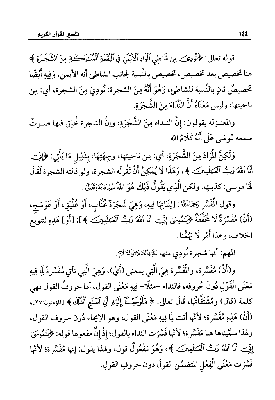 والمعتزلة يقولون: إِنَّ النداء مِنَ الشَّجَرَةِ، وإنَّ الشجرة خُلِق فيها صوتٌ سمعه مُوسَى عَلَى أَنَّهُ كَلَامُ اللَّهِ.